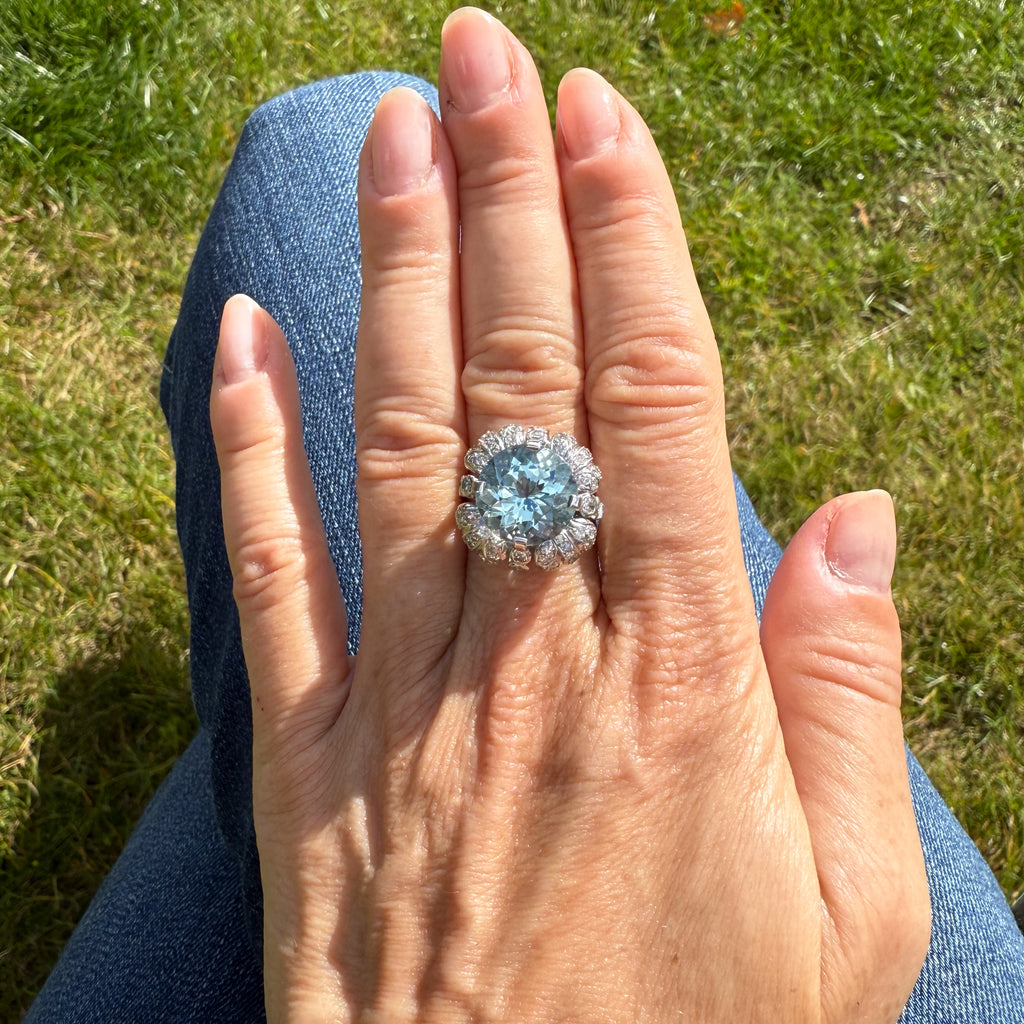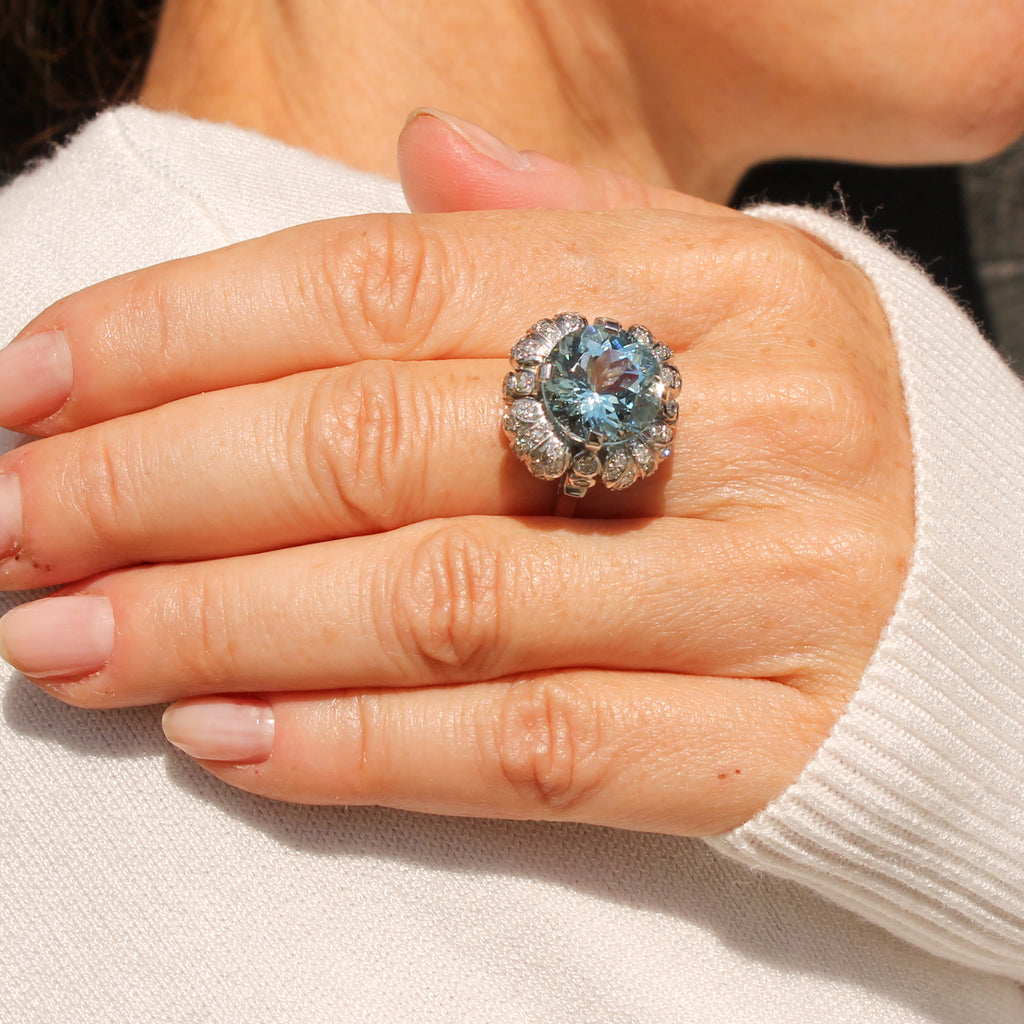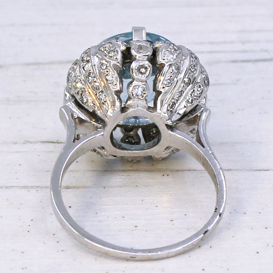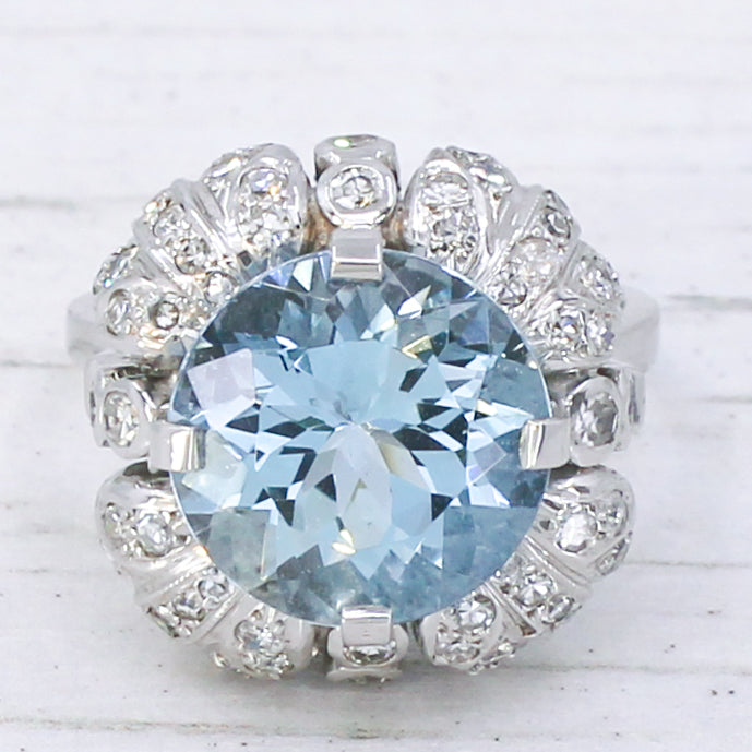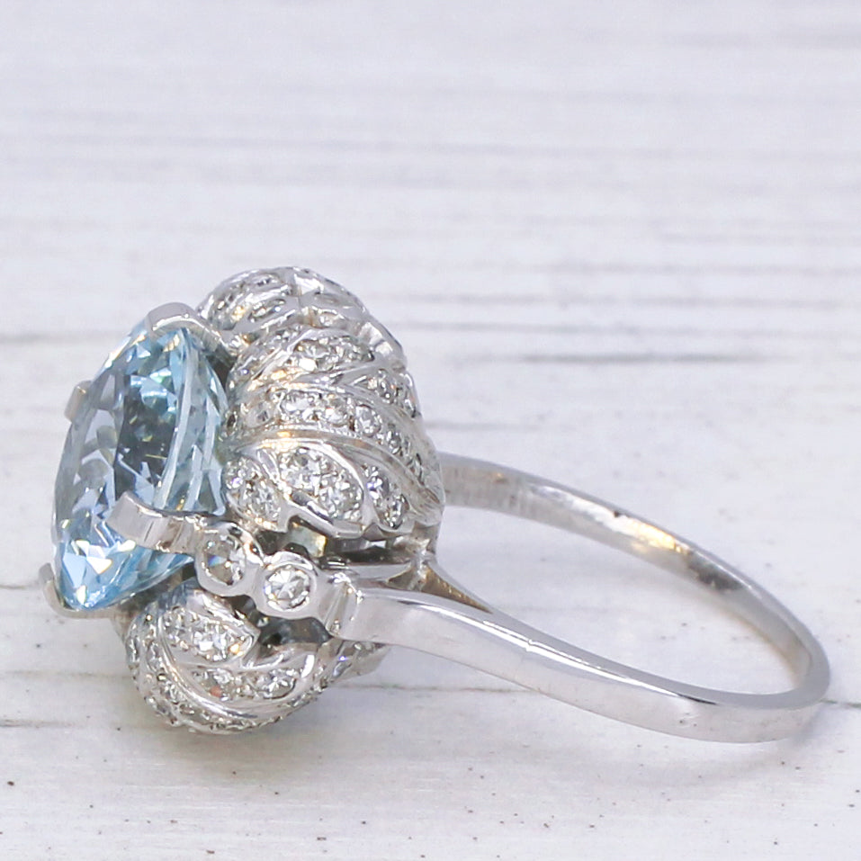 [message]A frankly awesome vintage aquamarine ring. The large, round centre stone displays a glowing and bright light blue, and is set atop the most impressively detailed platinum setting. Four wonderfully crafted leaves form the main part of the gallery which is set with an incredible 90 bright and white eight-cut diamonds. On a slim platinum shank.