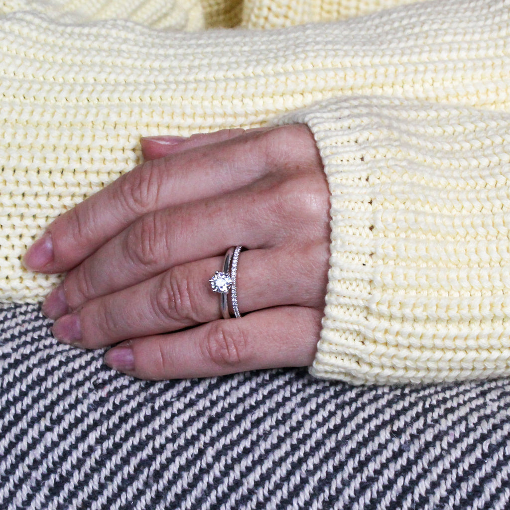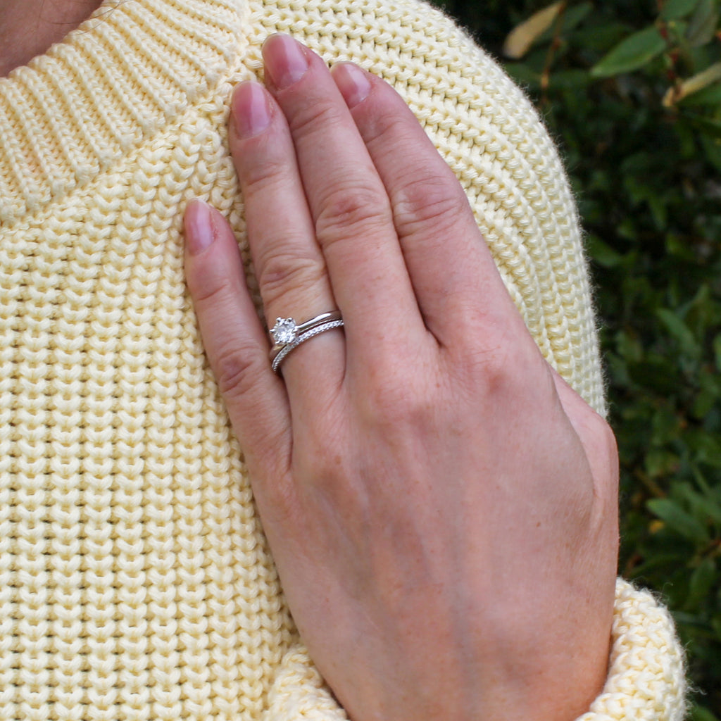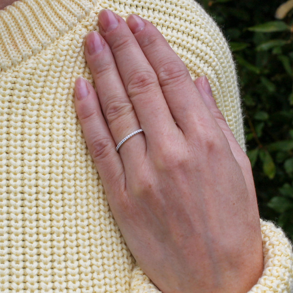 The example pictured is size 'N' and is set with 26 round brilliant cut diamonds with a total carat weight of 0.10.