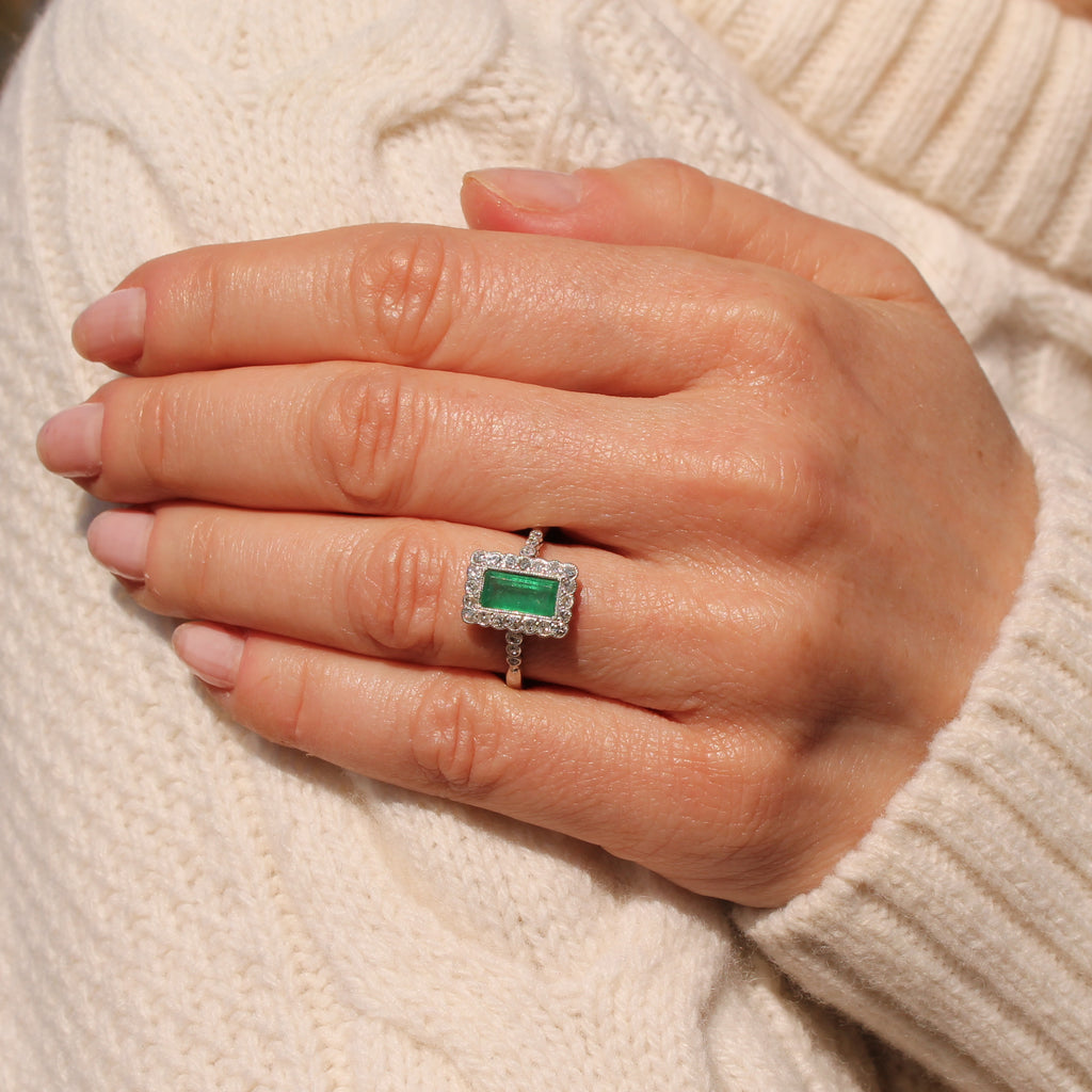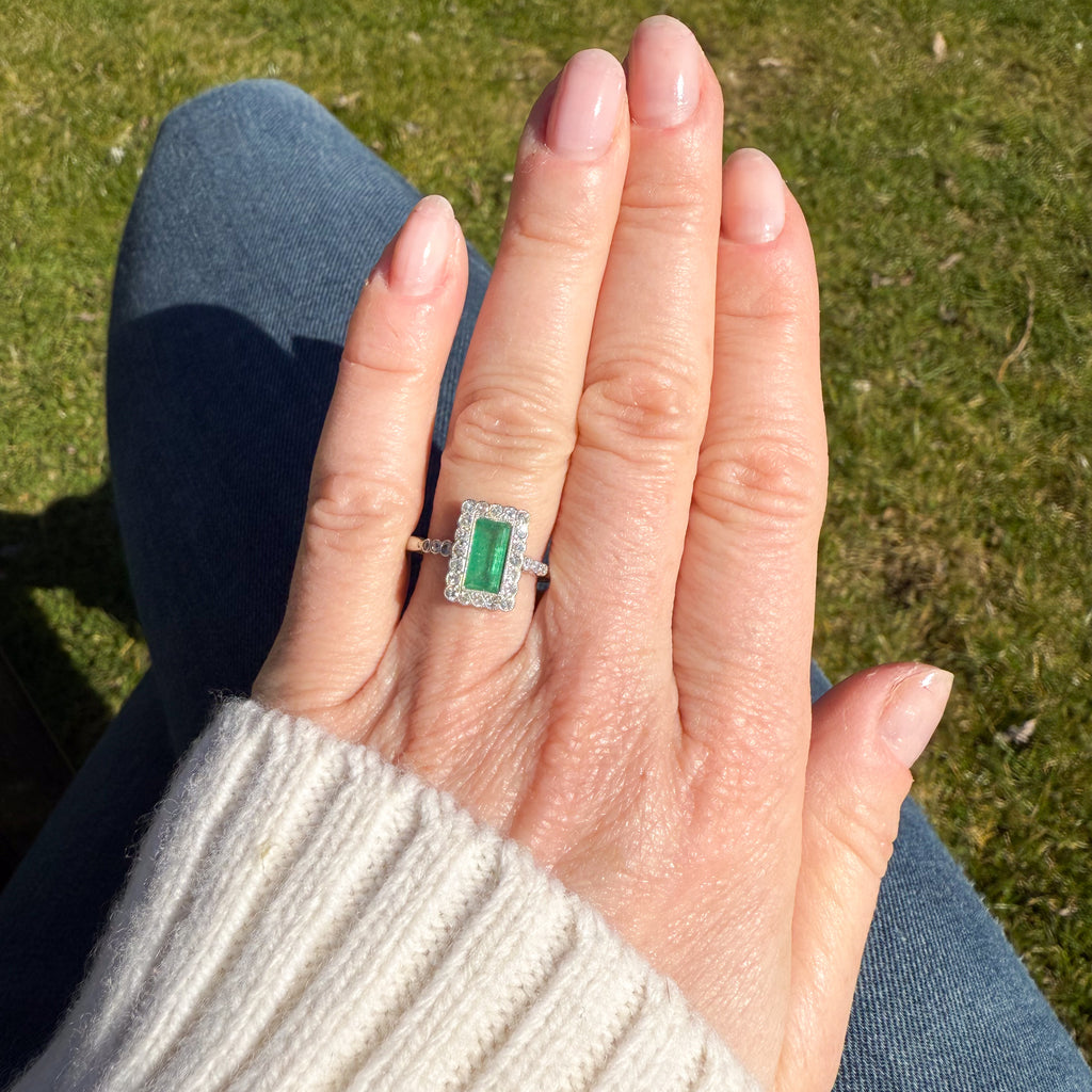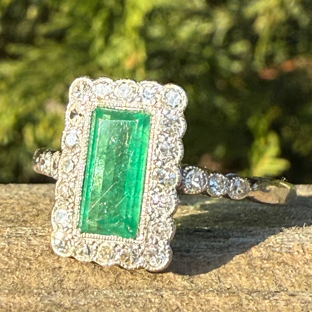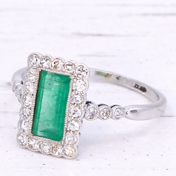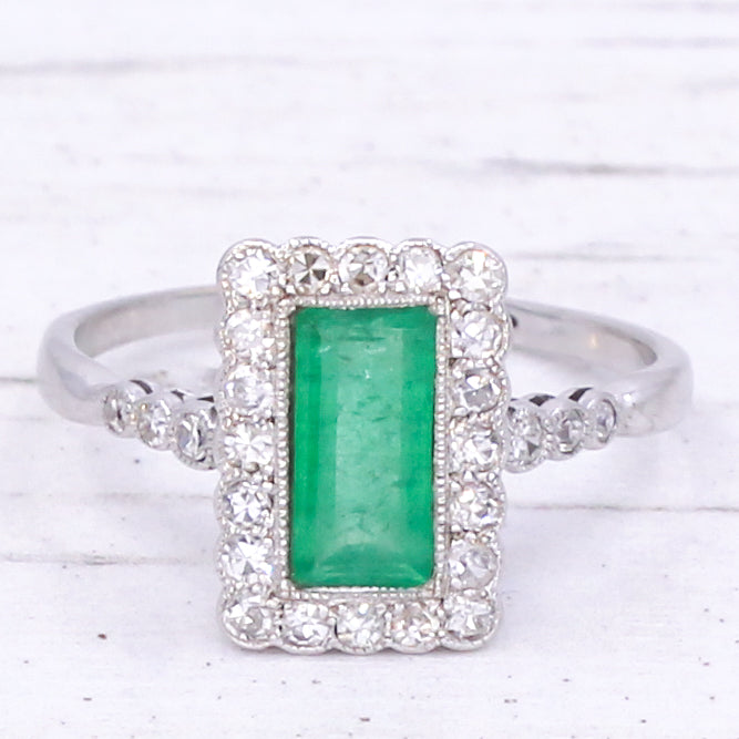 [message]A wonderful, wonderful vintage emerald ring. The baguette cut emerald displays a fresh and verdant green, and is rubover set in milgrained platinum within a surround of 20 eight-cut diamonds - also rubover set in milgrained platinum. The face of the ring sits nice and low to the finger, with six (three each side) further diamonds in the shoulders, leading to a slim 18k white gold shank.