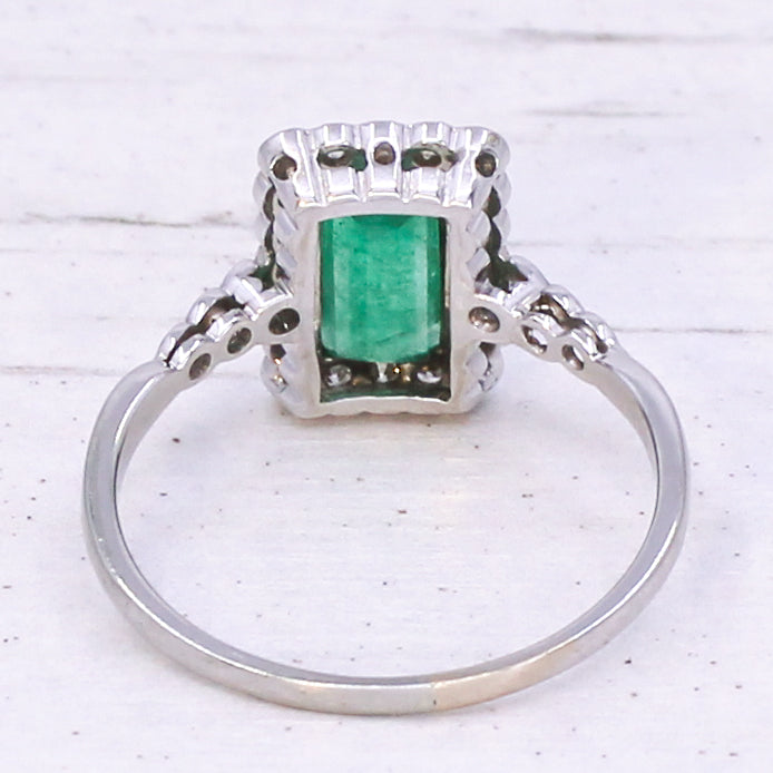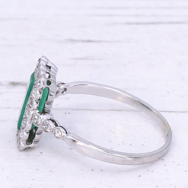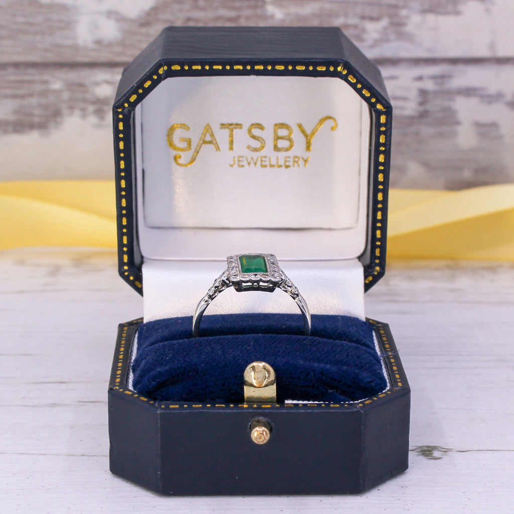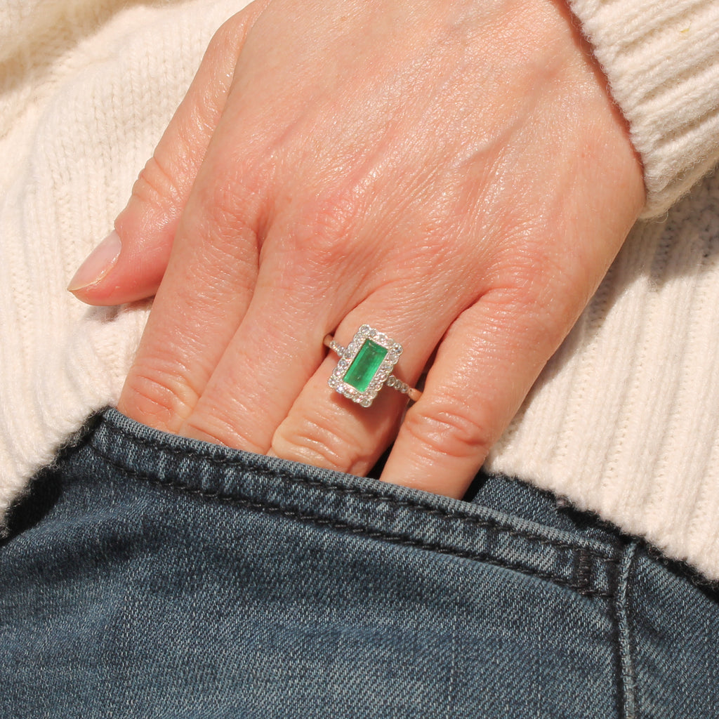 [message]A wonderful, wonderful vintage emerald ring. The baguette cut emerald displays a fresh and verdant green, and is rubover set in milgrained platinum within a surround of 20 eight-cut diamonds - also rubover set in milgrained platinum. The face of the ring sits nice and low to the finger, with six (three each side) further diamonds in the shoulders, leading to a slim 18k white gold shank.