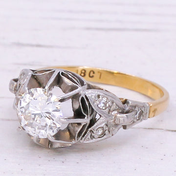 An exceptional vintage diamond solitaire ring. The transitional cut diamond in the centre is eye-poppingly white and bright, with plenty of life and fire. The stone is a secured in an eight-claw open collet above a scalloped back-plate, with stylised leaf detailing in the platinum shoulders which leads to a slim, 18k yellow gold shank.
