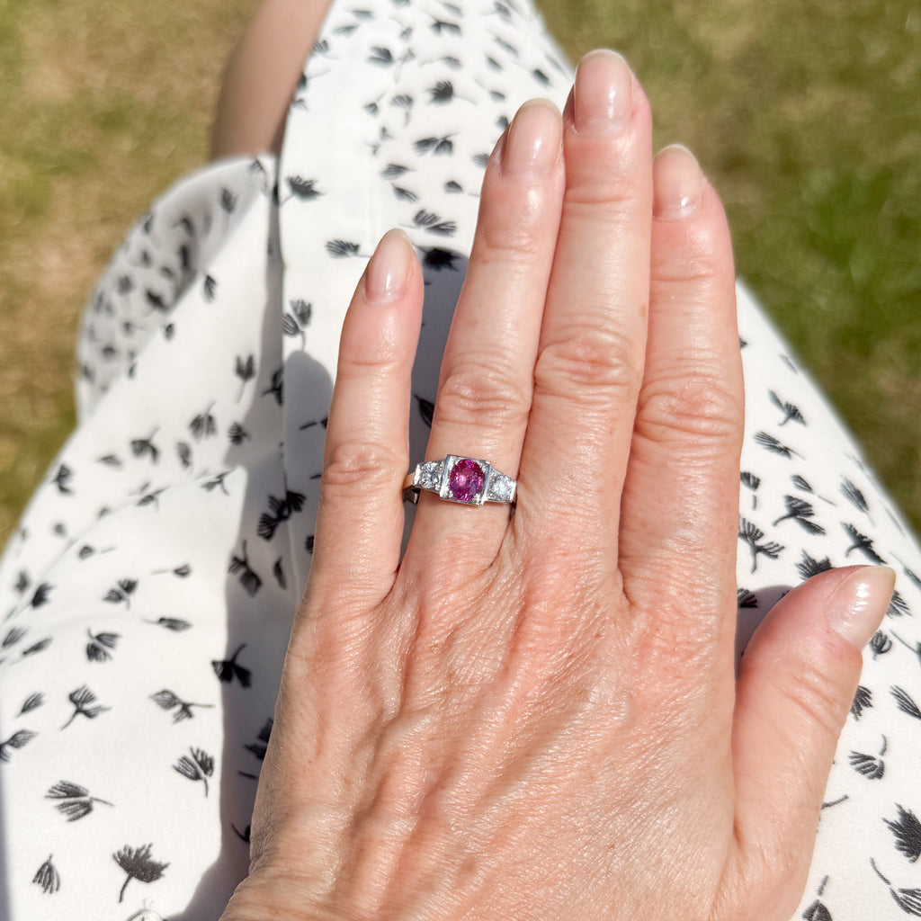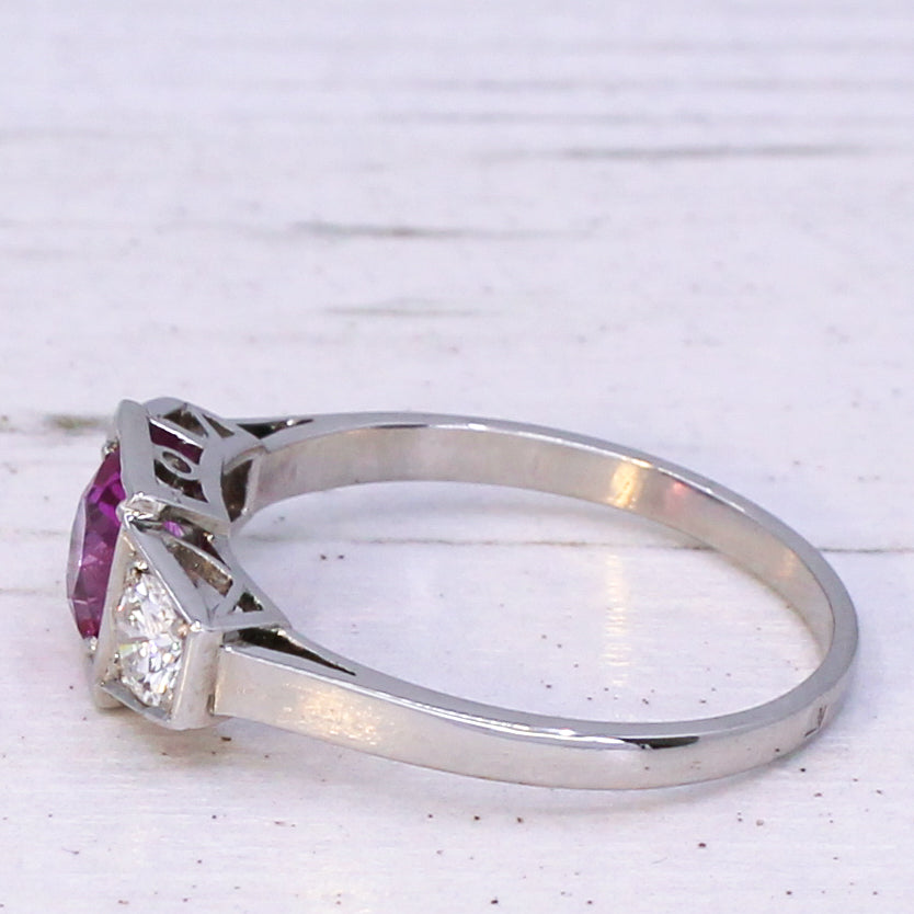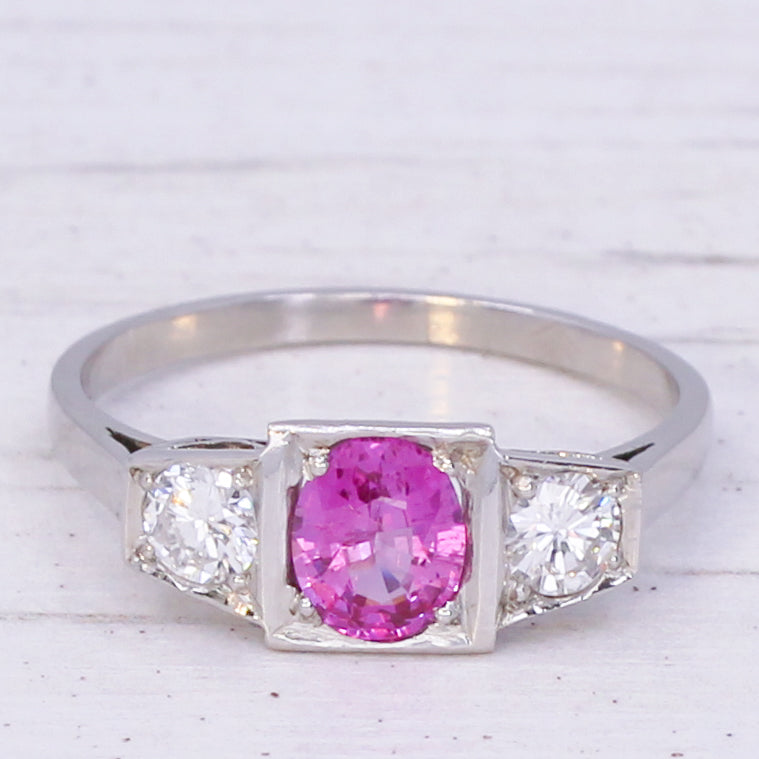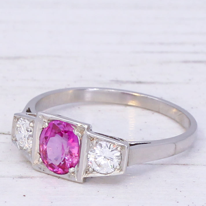 The most lovely pink sapphire and diamond three stone ring. The slightly oval cut pink sapphire in the centre displays a wonderfully vibrant electric pink, the colour of which is highlighted by high white round brilliant cut diamonds set either side. Each of the three gems sits within its own platinum box, lending this Mid Century ring a distinctly Art Deco feel.