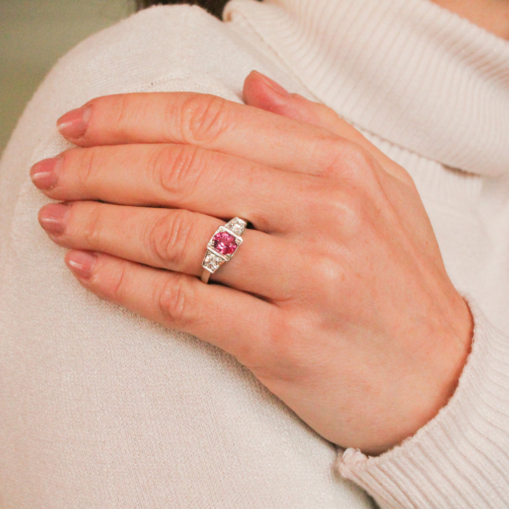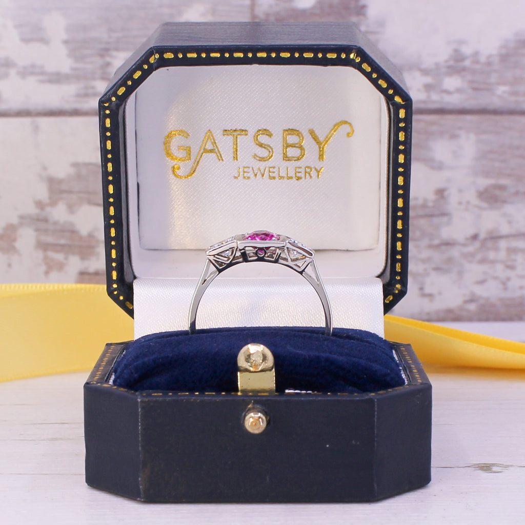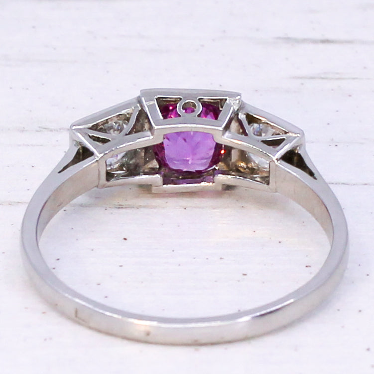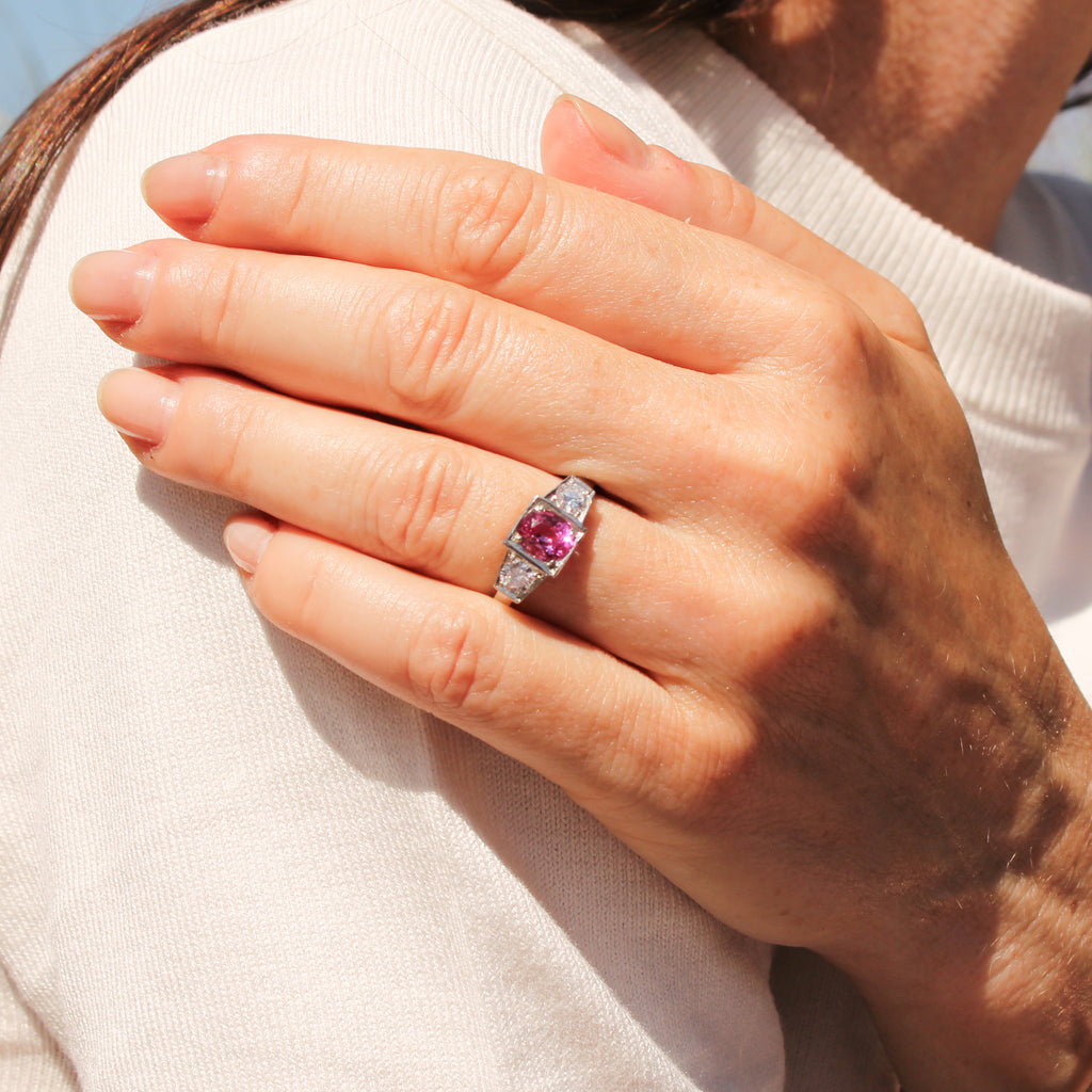 The most lovely pink sapphire and diamond three stone ring. The slightly oval cut pink sapphire in the centre displays a wonderfully vibrant electric pink, the colour of which is highlighted by high white round brilliant cut diamonds set either side. Each of the three gems sits within its own platinum box, lending this Mid Century ring a distinctly Art Deco feel.