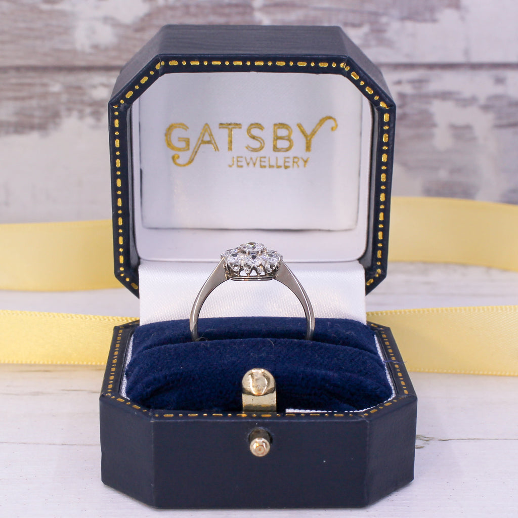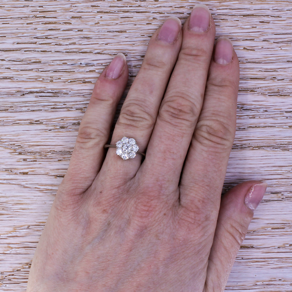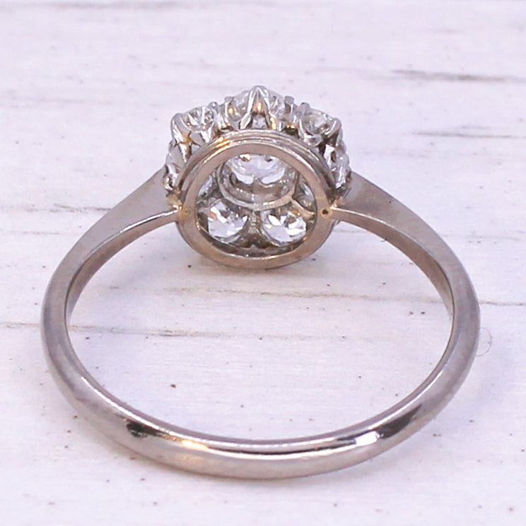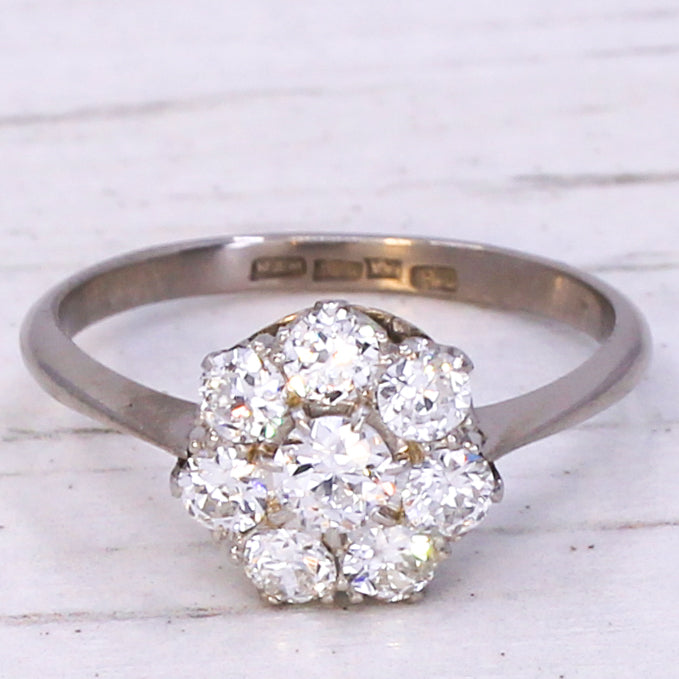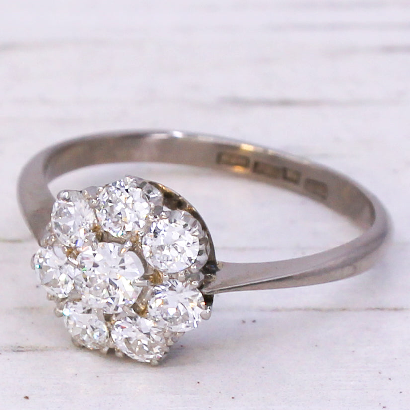 [message]A high class, high quality vintage diamond cluster ring. The high white and bright transitional cut diamond in the centre - weighing approximately 0.20 carat - is surrounded by seven further transitional cuts of matching quality in a platinum coronet setting. Sits nice and low to the finger on a slim and tapering 18k white gold shank.