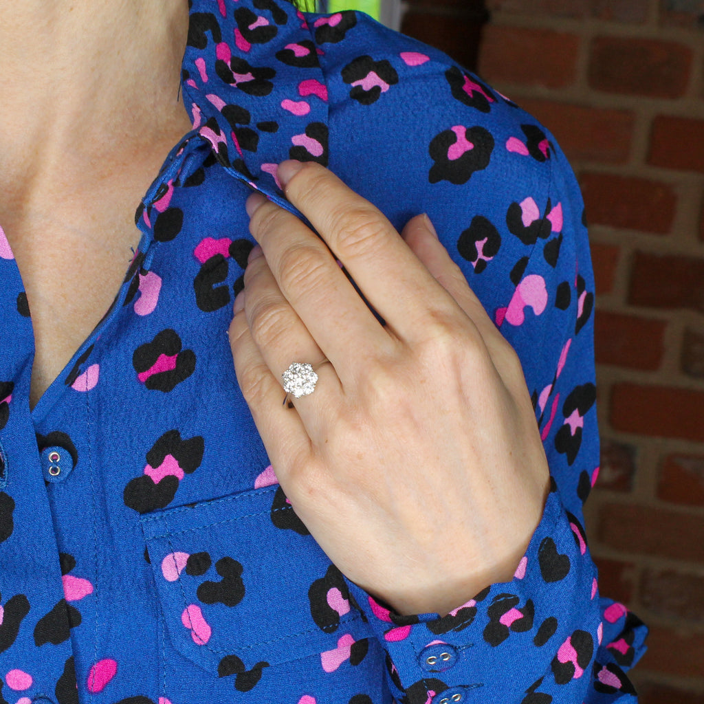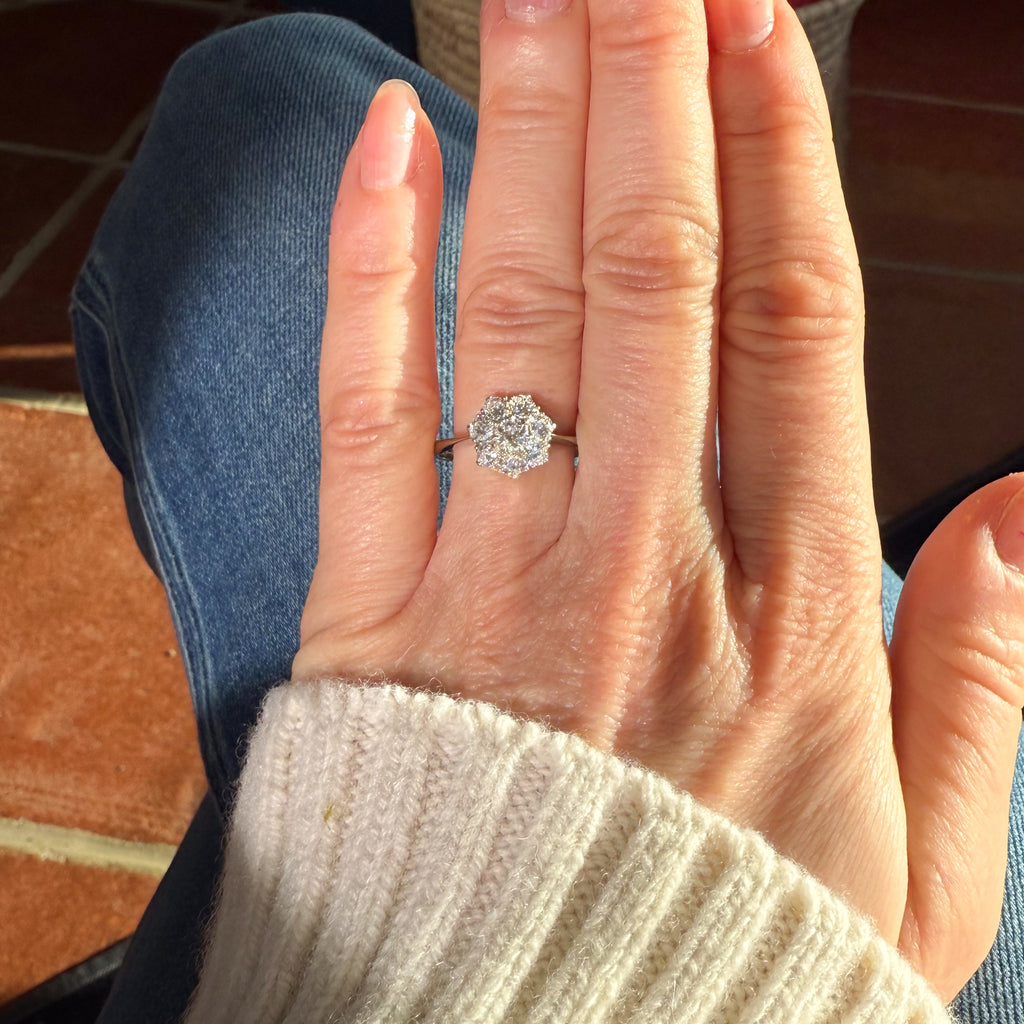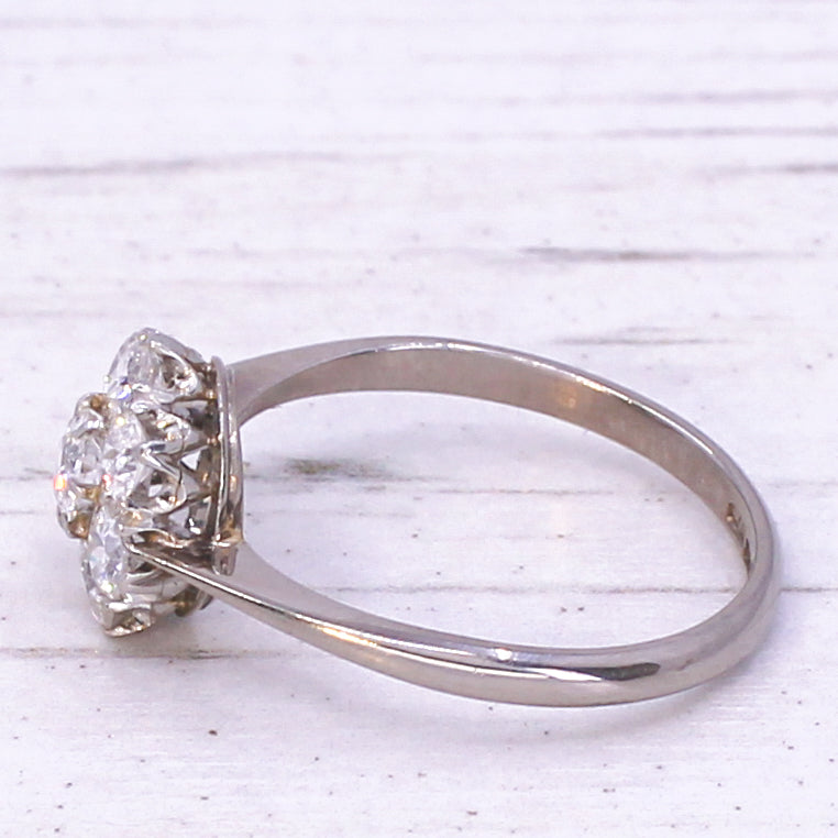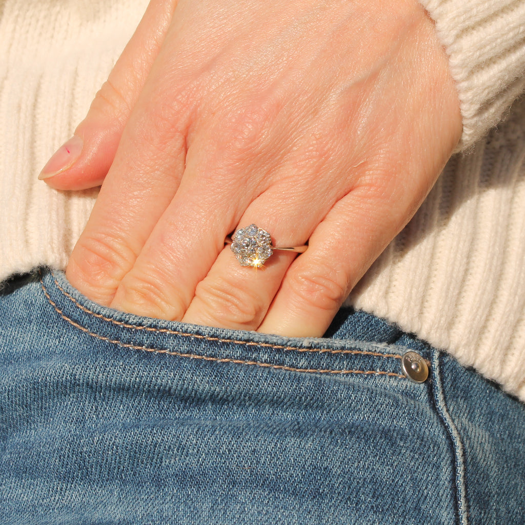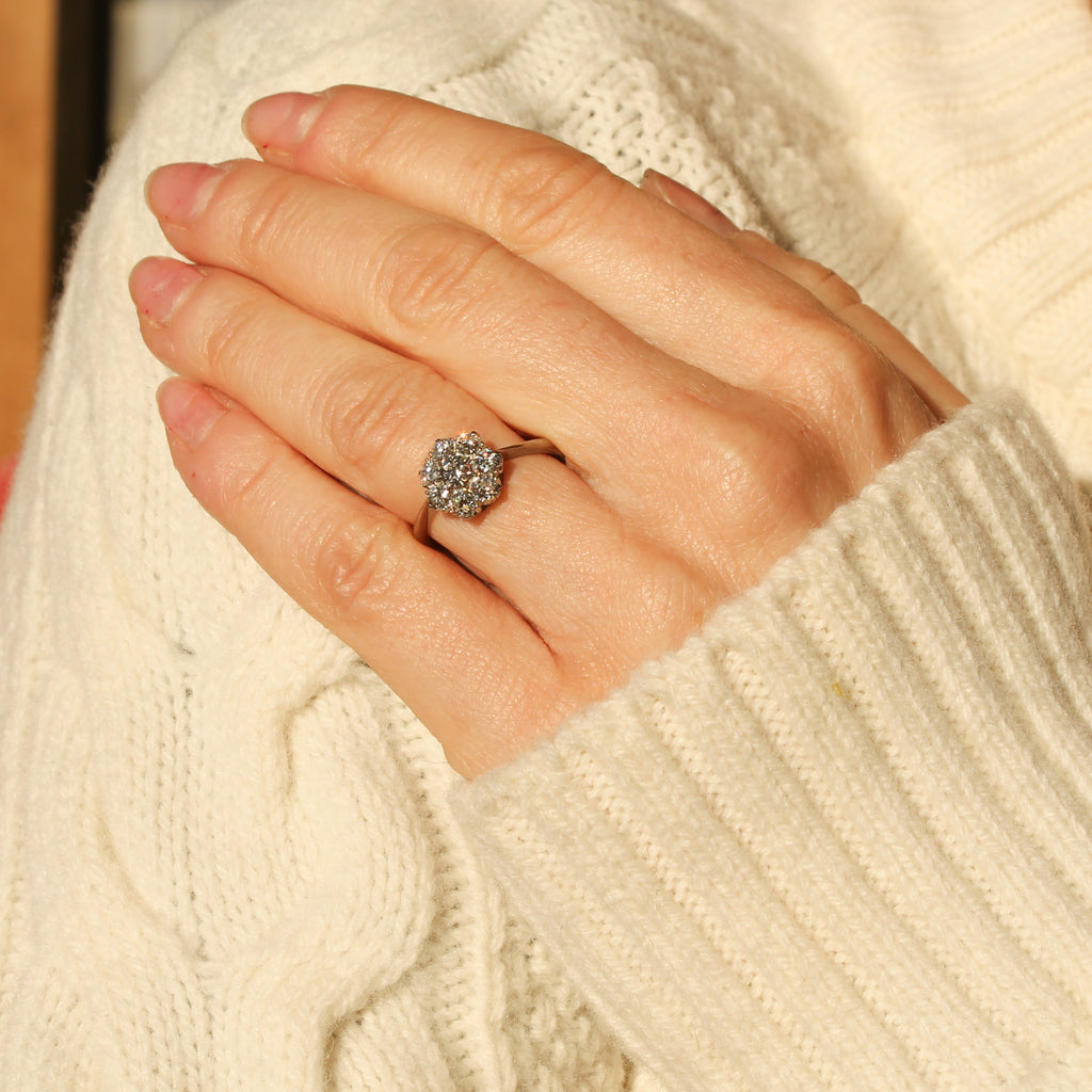 [message]A high class, high quality vintage diamond cluster ring. The high white and bright transitional cut diamond in the centre - weighing approximately 0.20 carat - is surrounded by seven further transitional cuts of matching quality in a platinum coronet setting. Sits nice and low to the finger on a slim and tapering 18k white gold shank.