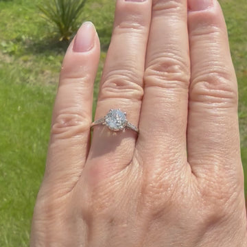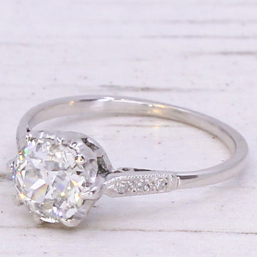 An indisputably lovely vintage diamond engagement ring. The old European cut diamond in the centre is bright, white and full of life and fire. The stone sis secured in an eight-claw white gold collet. Each shoulder is milgrained and set with three eight-cut diamonds, leading to a slender white gold shank. Magical and timeless.