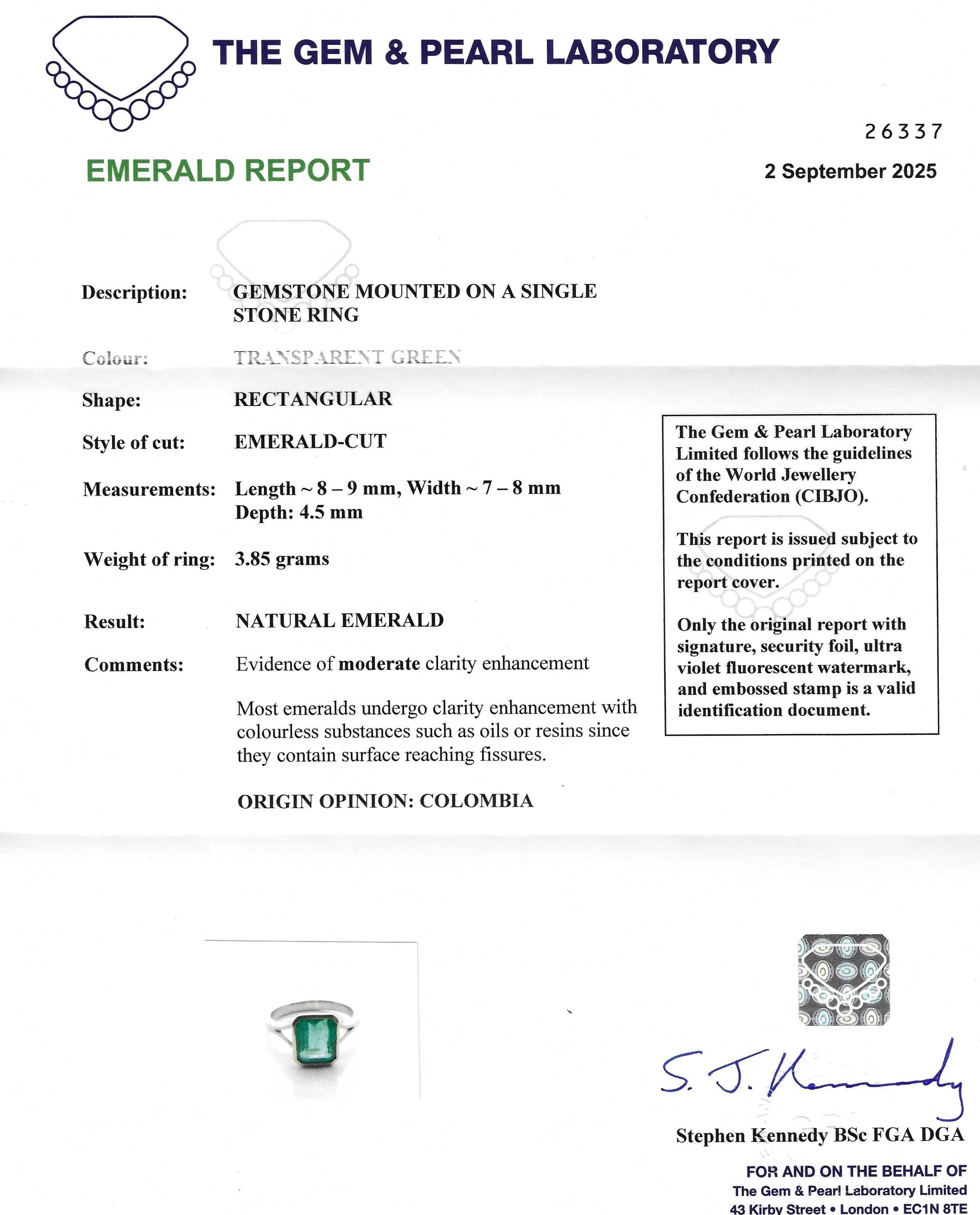 Accompanied by an emerald report from The Gem & Pearl Laboratory stating the emerald shows evidence of moderate clarity enhancement, and is Colombian in origin.