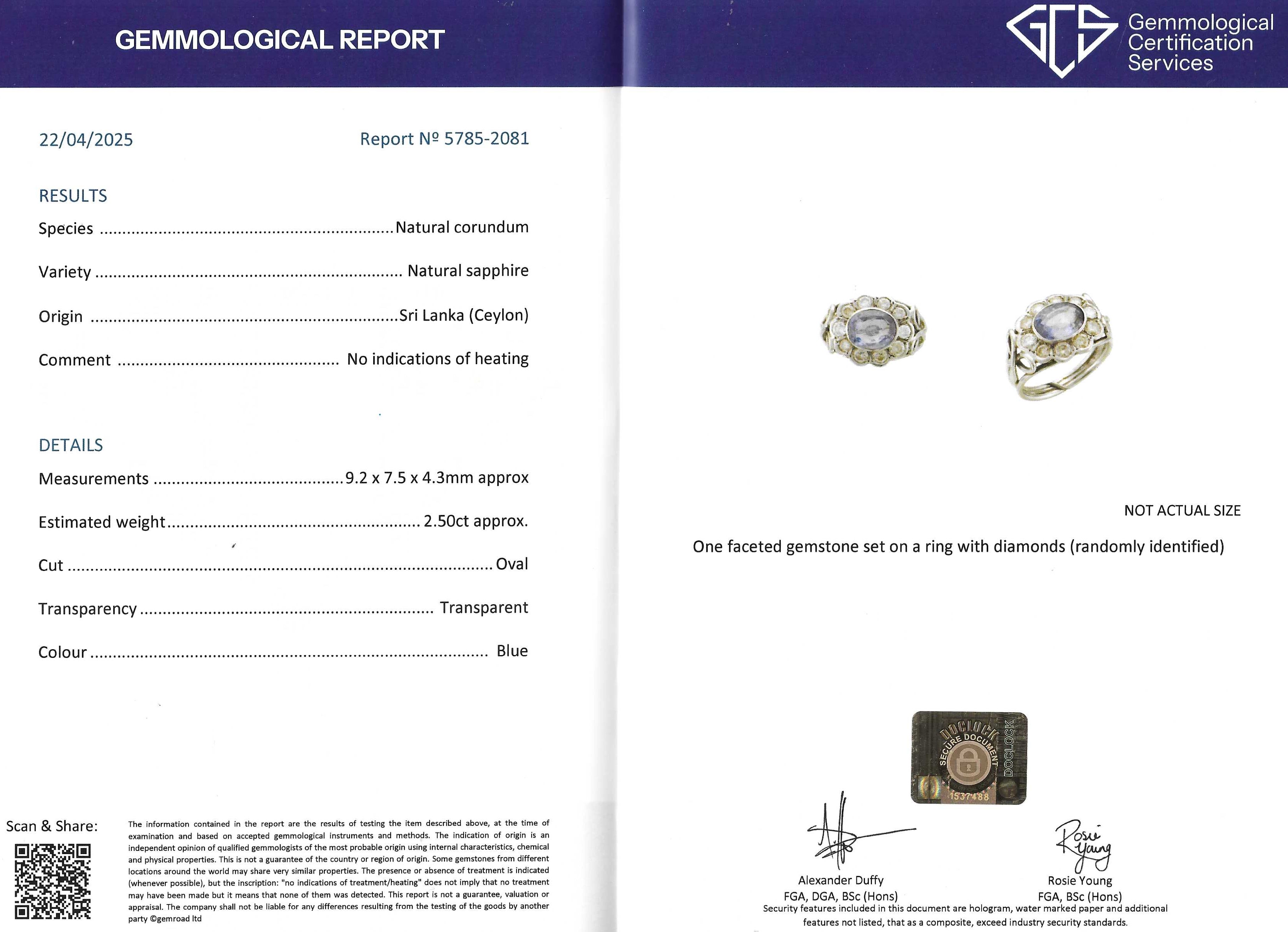 Accompanied by a sapphire report from Gemmological Certification Services (GCS) stating the sapphire shows no indication of heating, and is Sri Lankan (Ceylon) in origin.