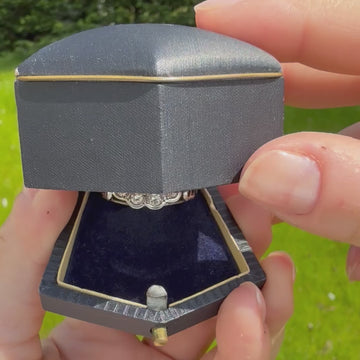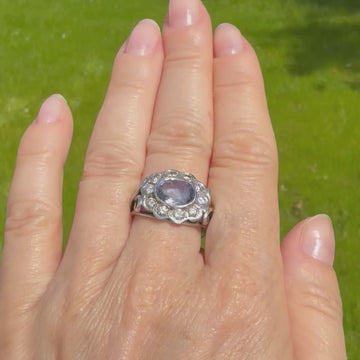 [message]A stylish and unique vintage cluster ring. The sapphire in the centre - certified as natural, unheated, and originating from Ceylon (Sri Lanka), displays a soft but vibrant cornflower blue. The stone is rubover set in 18k white gold and surround by ten round brilliant cut diamonds. The cluster sits nice and low to the finger, with distinctive bow detailing in the shoulders, leading to a triple-wire 18k white gold shank.