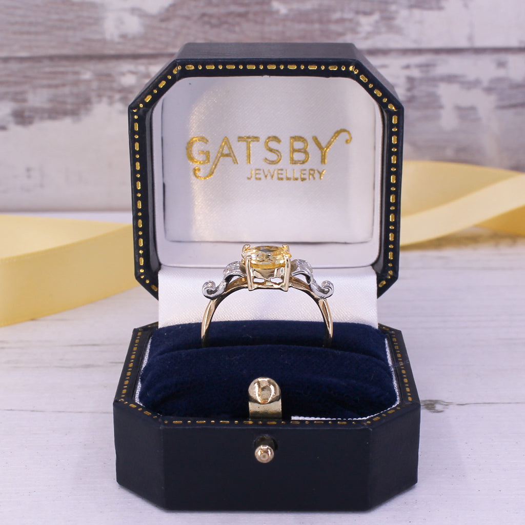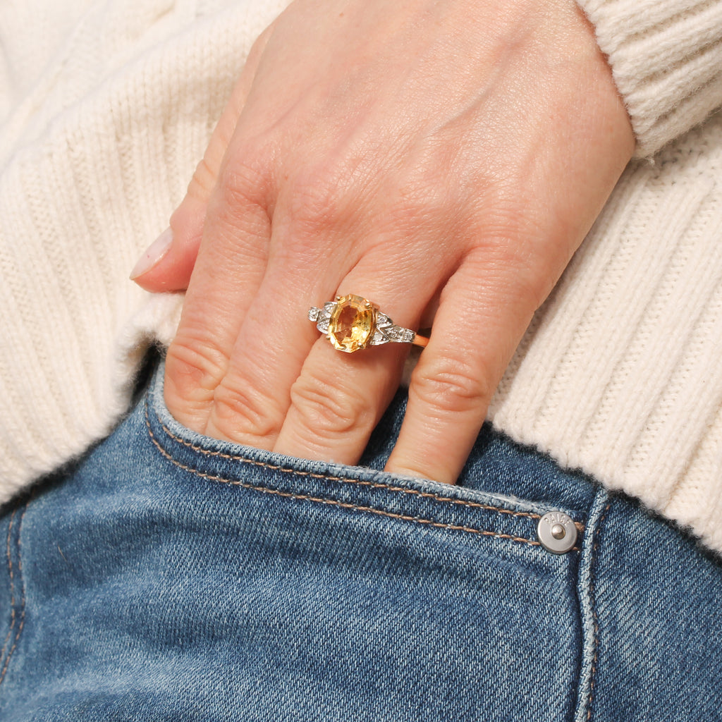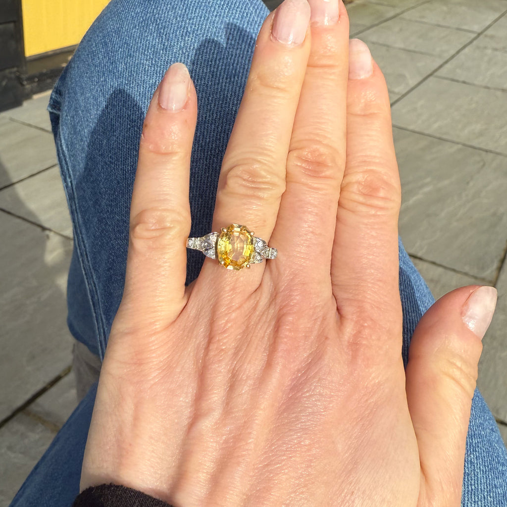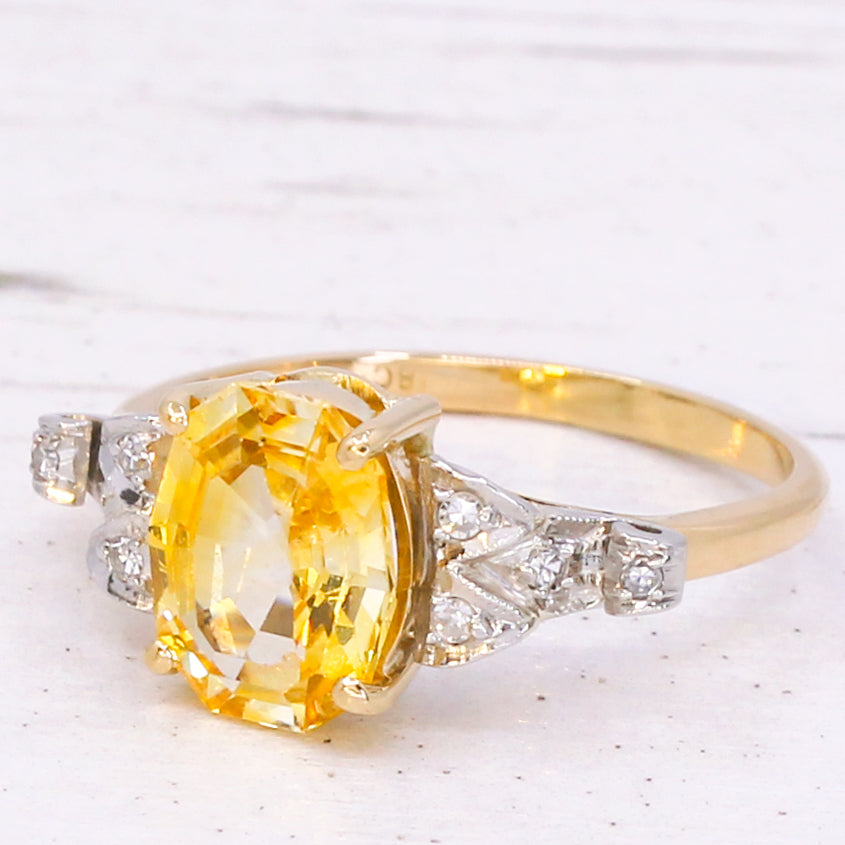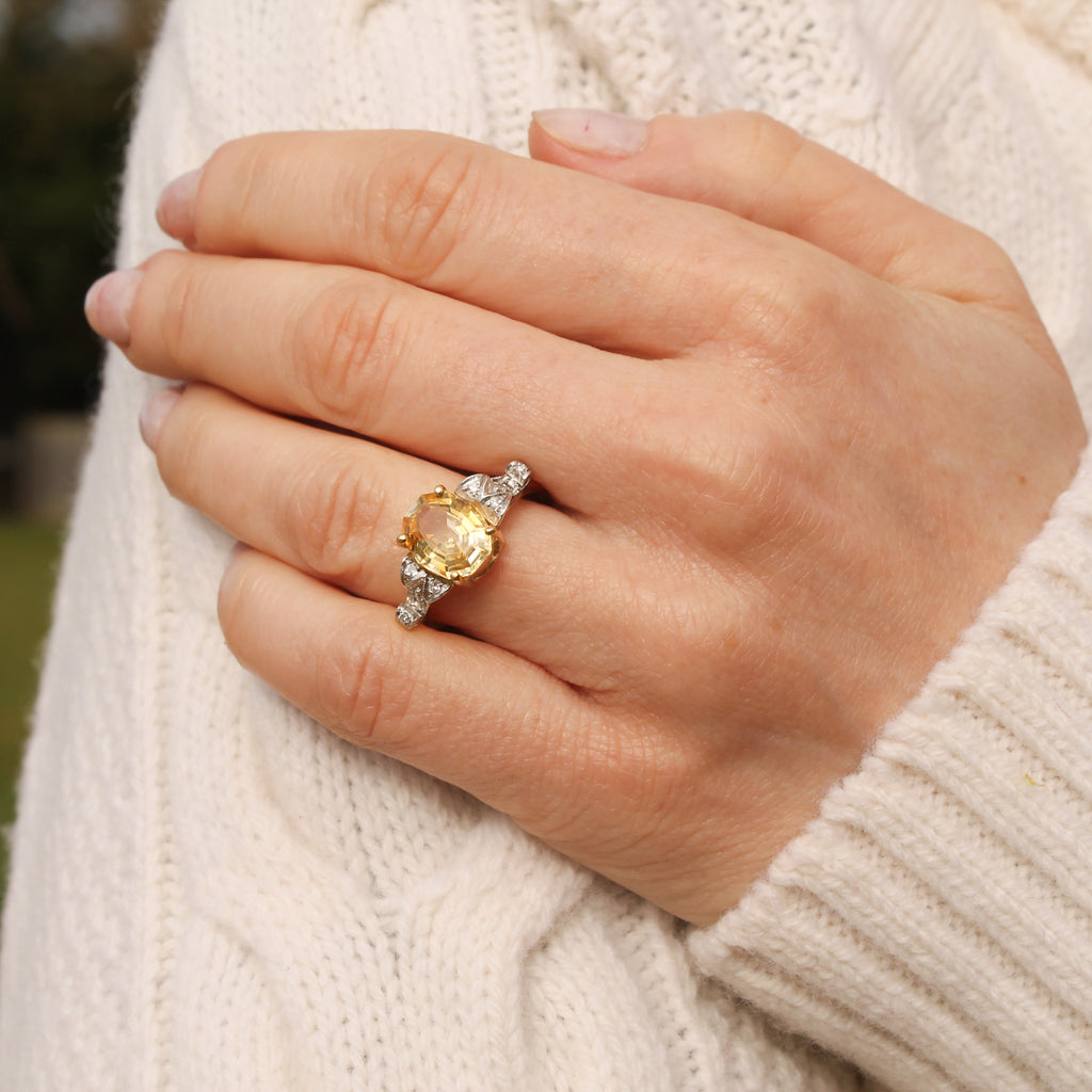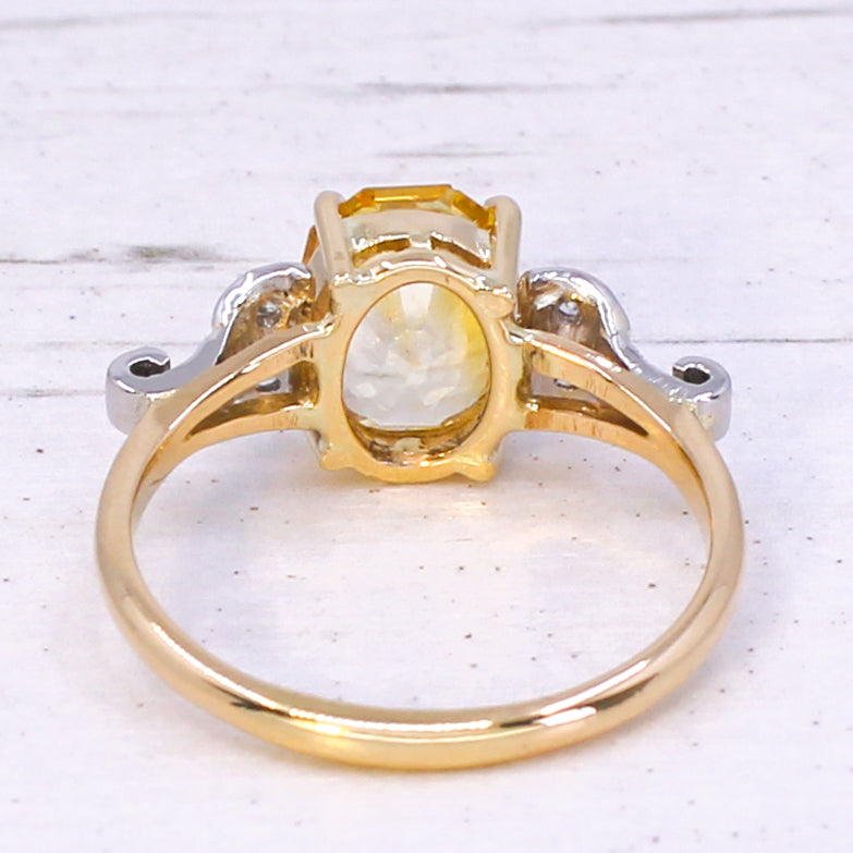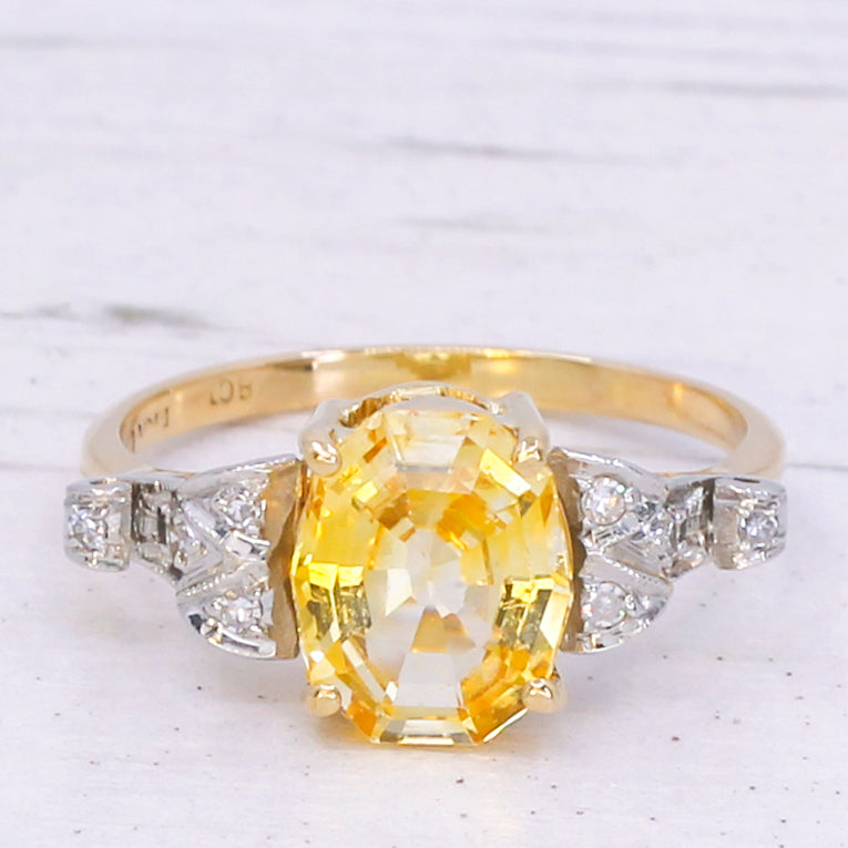 A vintage yellow sapphire ring of quality and style. The uniquely cut sapphire in the centre – certified as natural, heated, and originating from Ceylon (Sri Lanka) – is a long decagon and displays a vibrant golden yellow. The stone sits nice and low to the finger and is flanked by flamboyant platinum shoulders set with eight (four each side) eight-cut diamonds, leading to a slender 18k yellow gold shank. A wonderfully individual ring.