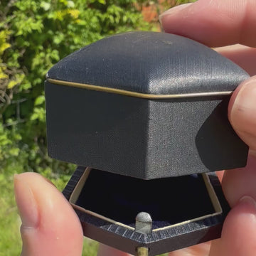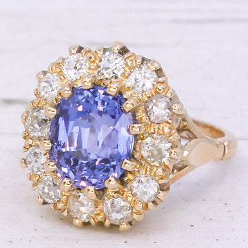 [message]A seriously impressive vintage sapphire ring. The sapphire in the centre - certified as natural and unheated - displays a clear colour change; blue in daylight, purple in artificial light. The sapphire is surrounded by twelve old mine cut diamonds in a coronet setting, leading to trefoil shoulders to a slim D-shaped shank.
