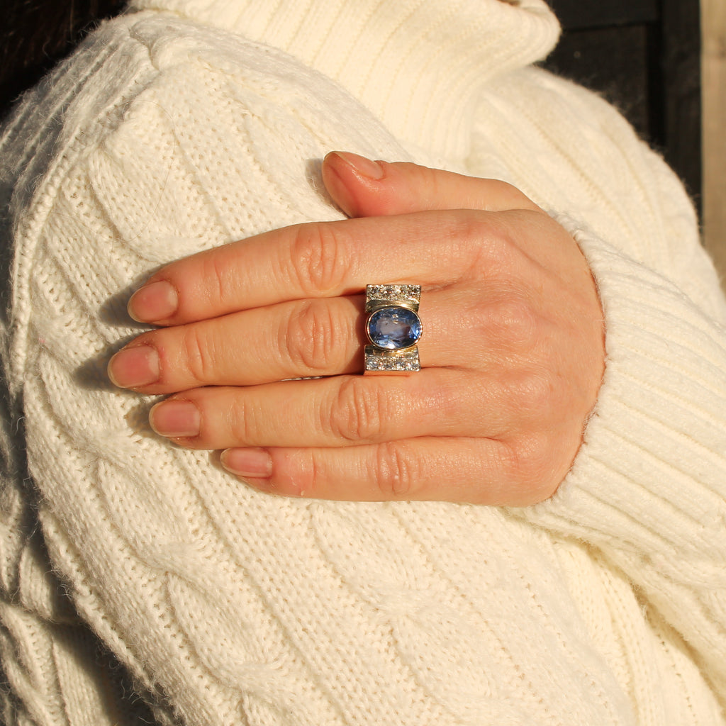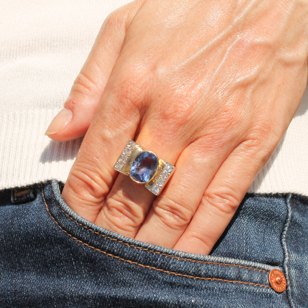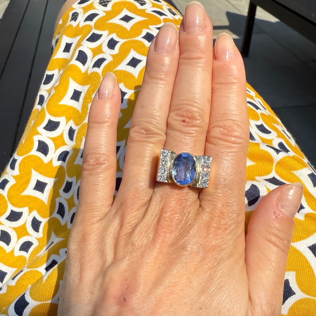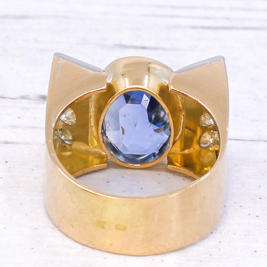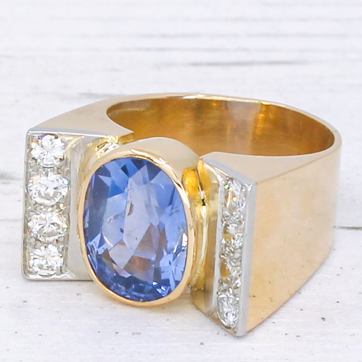 An extraordinary vintage sapphire ring. The sapphire in the centre - certified as natural, unheated and originating from Ceylon (Sir Lanka) - displays a bright and vivid blue. The stones is rubover set in yellow gold, and sits within between bold, almost architectural shoulders set with eight (four each side) transitional cut diamonds in platinum, to a wide and flat 18k yellow gold shank. A substantial, serious, and impressive mid century ring.