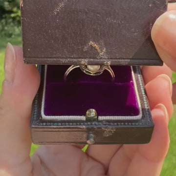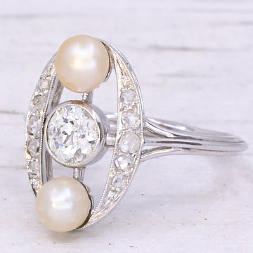 [message]Everything about this vintage pearl and diamond ring is wonderful. The old European cut diamond in the centre (weighing approximately half a carat) is high white and bright, and is rubover set in milgrained white gold. To the 'north' and 'south' of the centre stone are creamy, lustrous, natural pearls (certified as not cultured). Two crescents, each set with five rose cut diamonds, embrace the central trilogy of gems, leading to a triple-wire shank which splits at the shoulders. Exception design executed with exception gems.