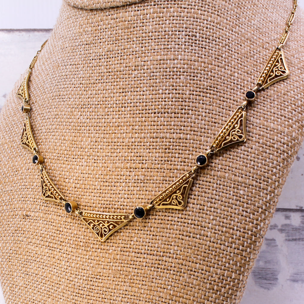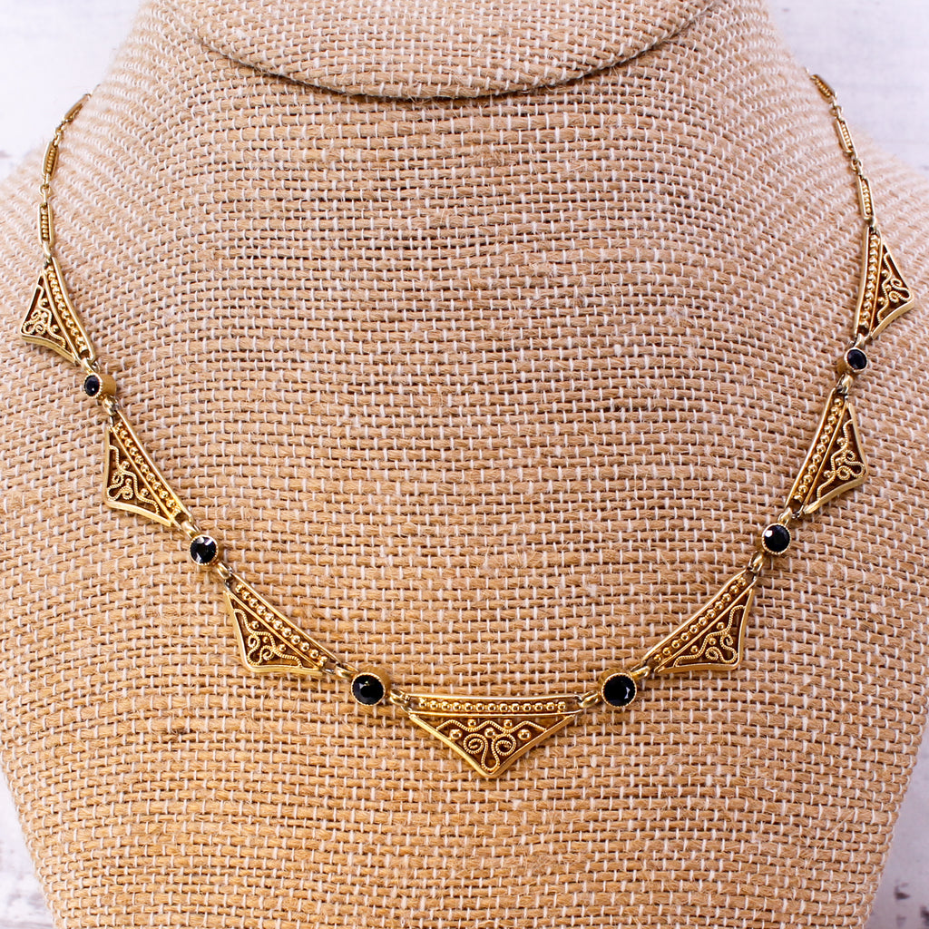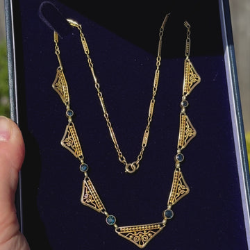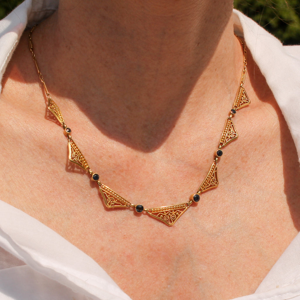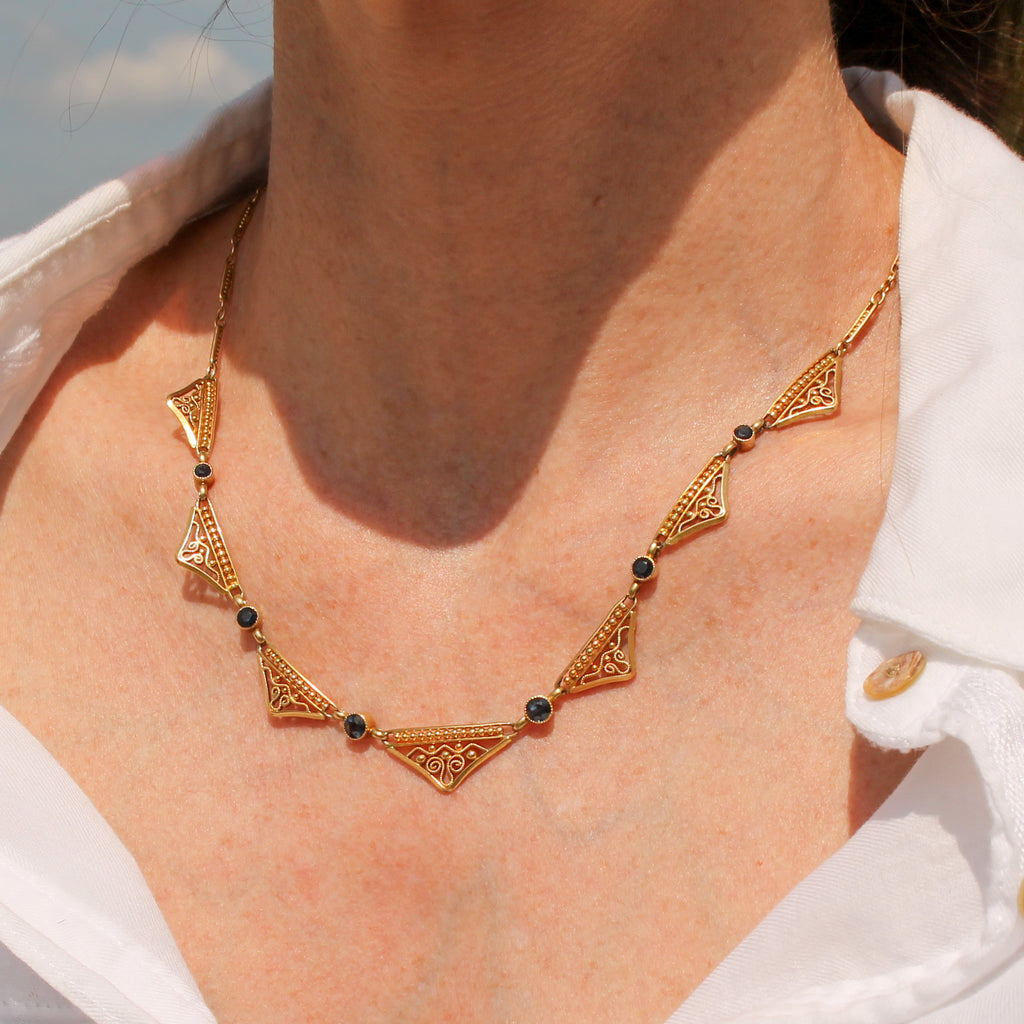 [message]A beautifully made vintage necklace which manages to be both wonderfully opulent and utterly wearable. Comprised of seven triangular panels which graduate in size towards the largest one at the bottom, but which are otherwise identical: each featuring fine milgrained gold wire-working and beading. Each of the panels is inter-spaced with a deep blue sapphire (again, of graduating sizes) in milgrained rubover settings. With fancy links to the rear and secured with a round bolt-ring