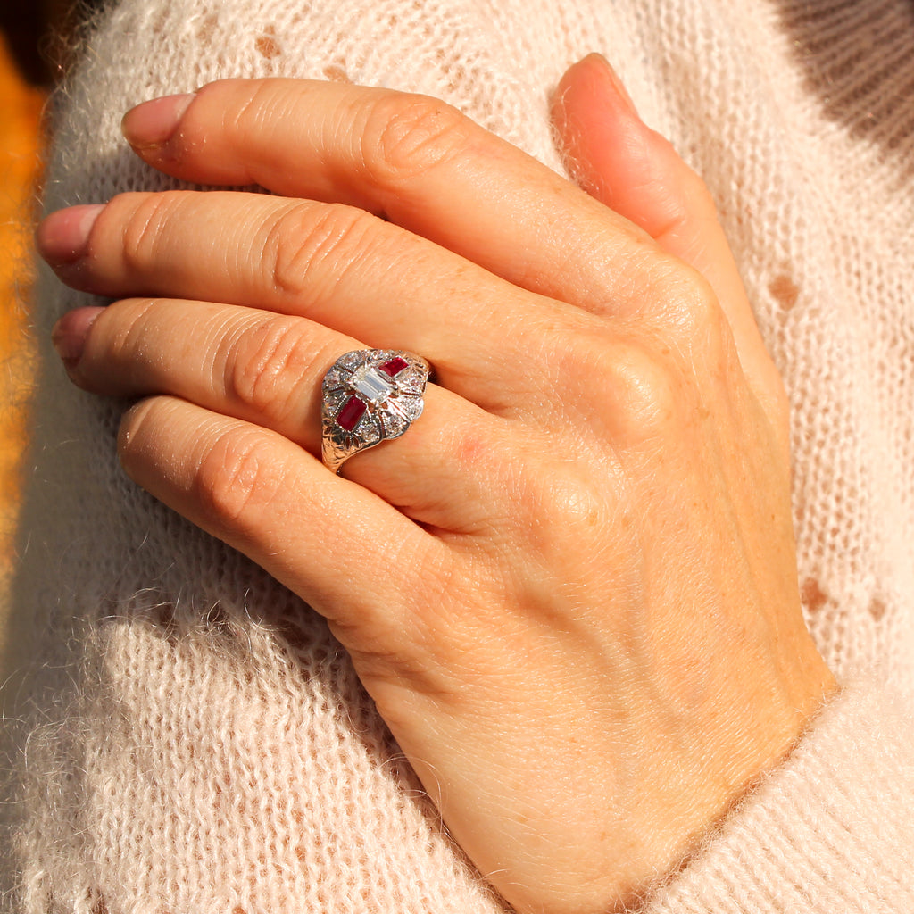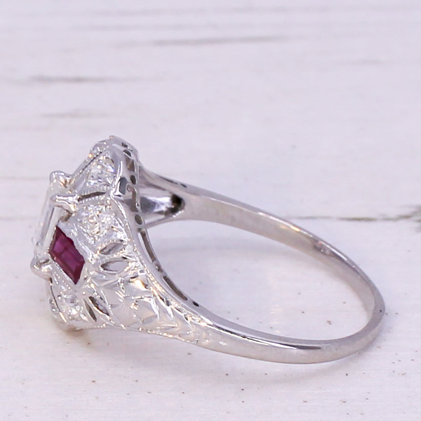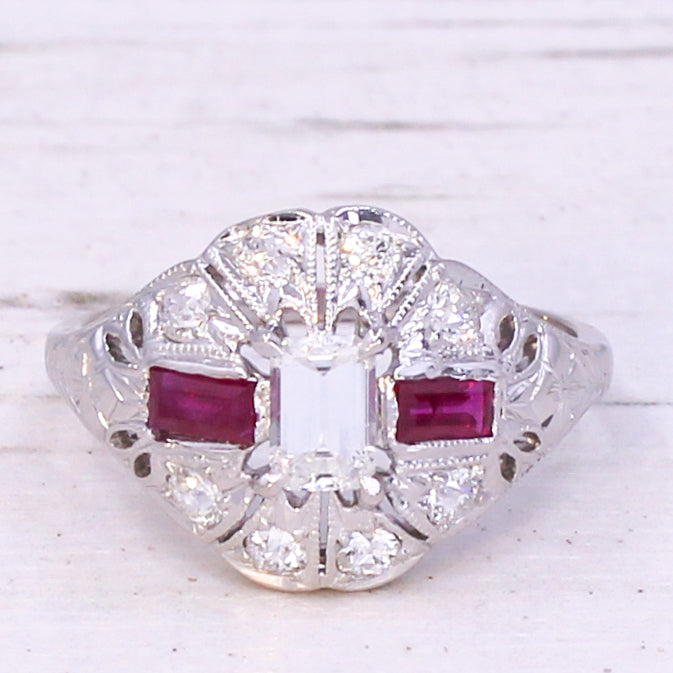 [message]A beautiful vintage ruby and diamond ring. The white and ice-clear emerald cut diamond in the centre is secured by four claws, and is accented by a pair of bright red rubies. The beautifully pierced, milgrained and engraved gallery is complemented by eight old cut diamonds, leading to a slim D-shaped shank.