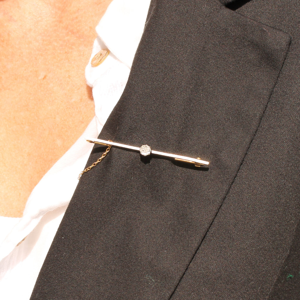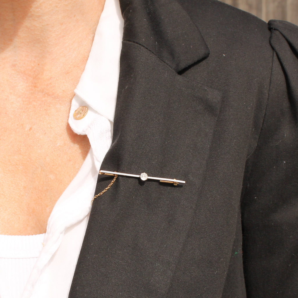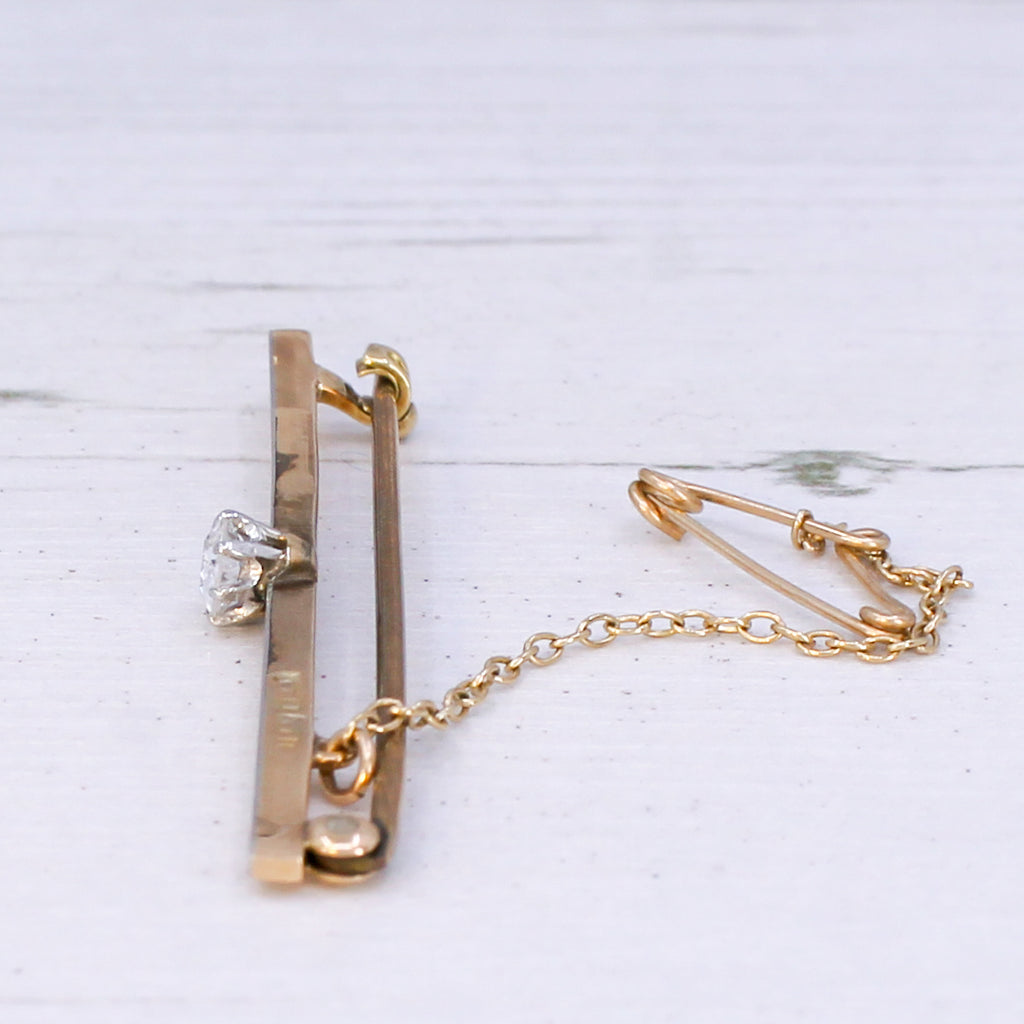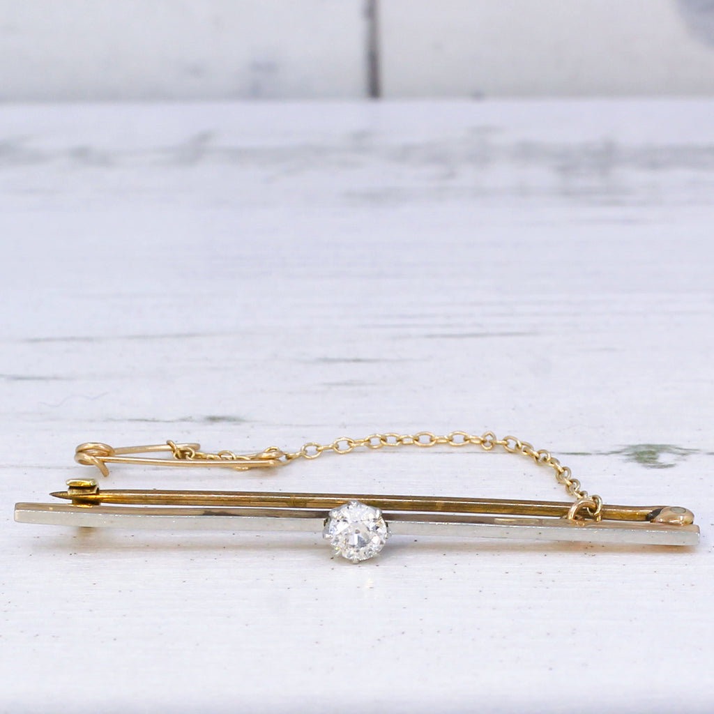 A high class late Victorian pin brooch featuring a high white, bright, and internally clean old European cut diamond in a platinum eight-claw coronet setting. The diamond sits centrally on a 15k yellow gold pin which is over-layed in platinum.