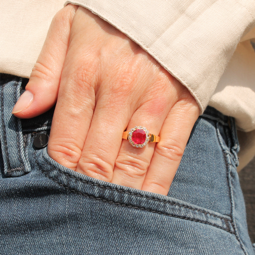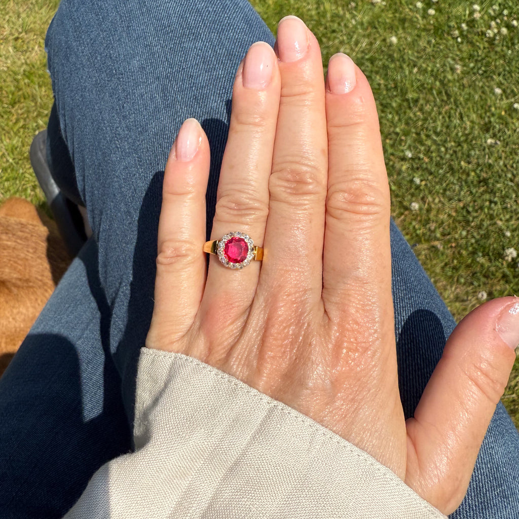 An exceptional Victorian spinel ring. The brigh and amazingly vibrant red spinel - certified as natural, unheated and originating from Myanmar (Burma) - is set within a surround of fourteen old mine cut diamonds in a finely pierced coronet setting crafted in high karat yellow gold. On a wide, reverse tapering, flat, gold shank.