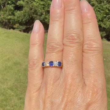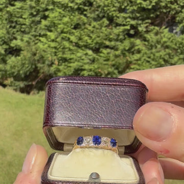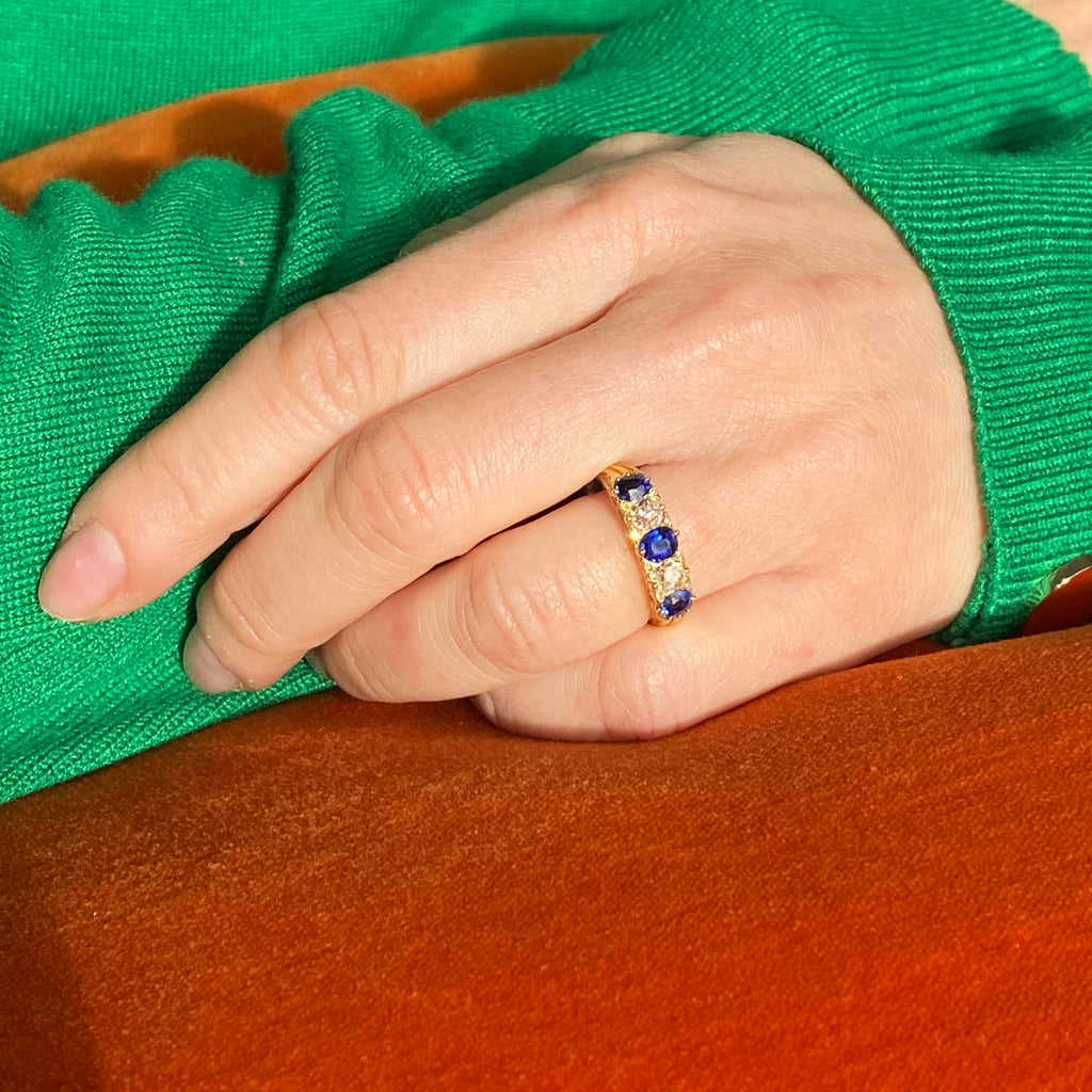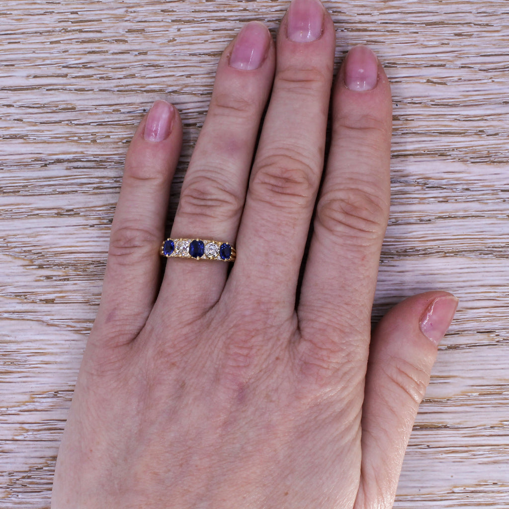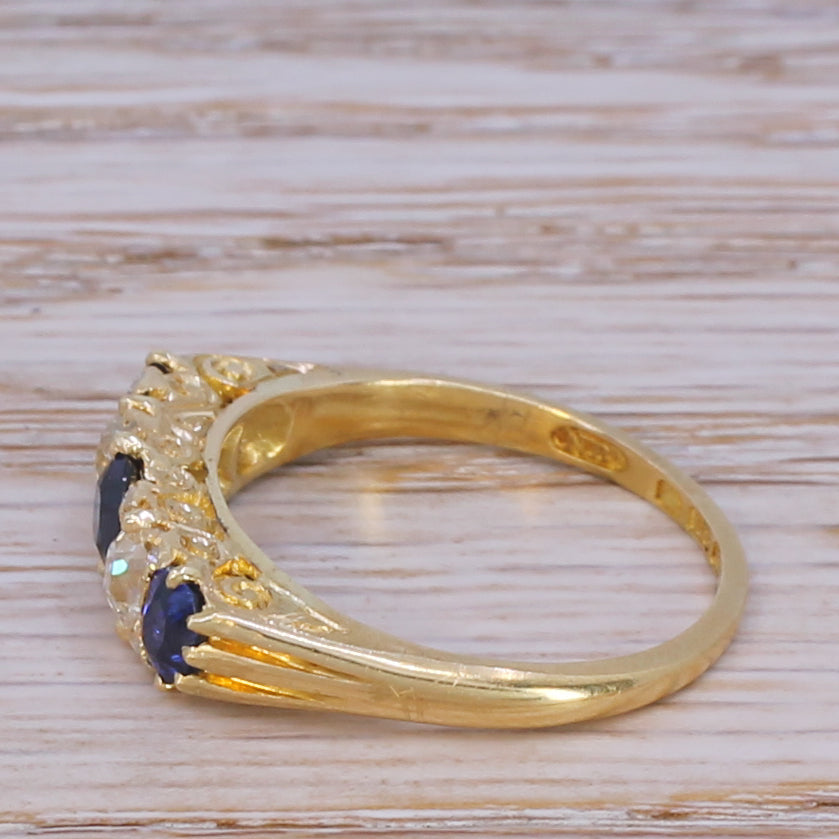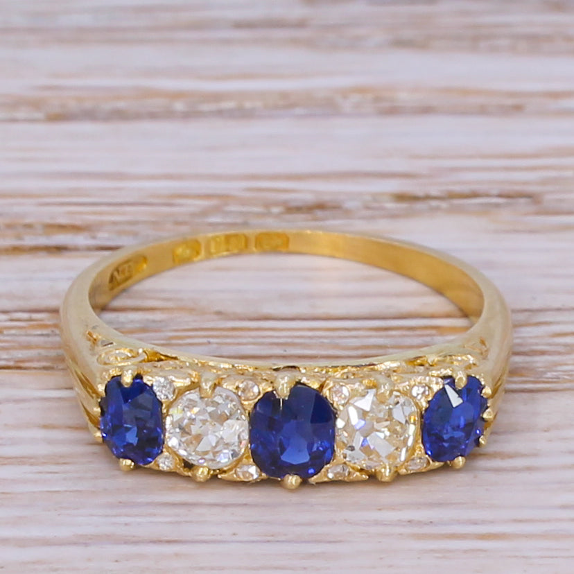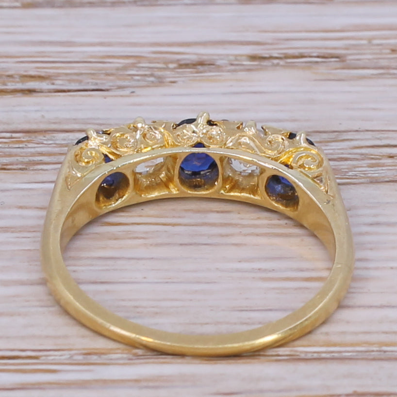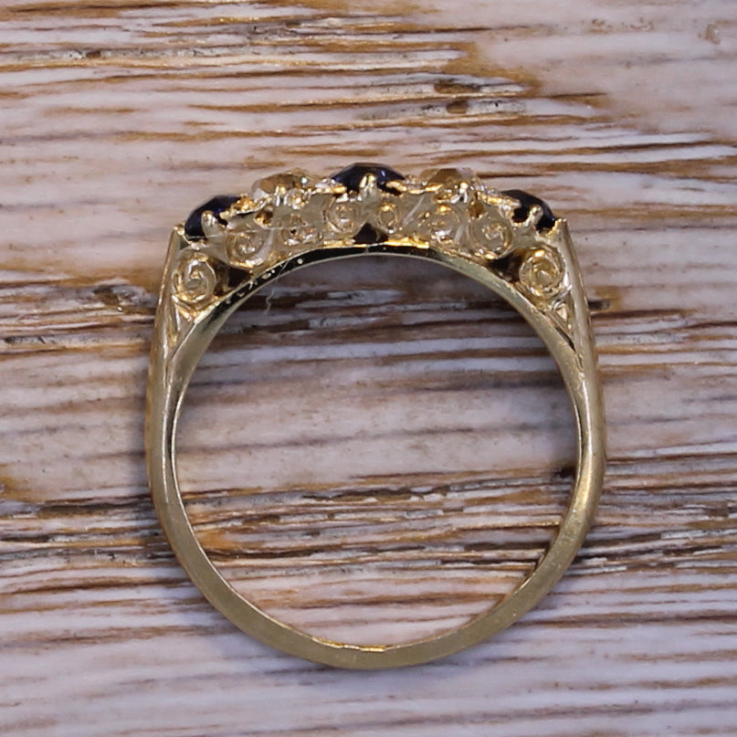 An absolutely extraordinary Victorian sapphire and diamond ring. Set with three sapphires of the most electric blue, with two white and bright old mine cut diamonds and eight very small diamond spacers between each of the five main gems. The stones nestle within a beautifully carved gallery, leading to a double vented shoulders and a slim, D-shaped shank. A top class example of a Victorian classic.