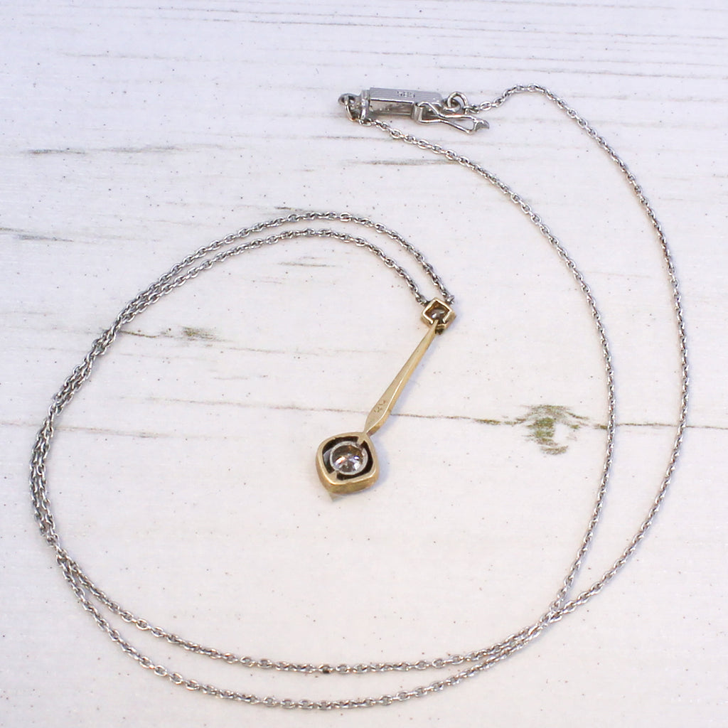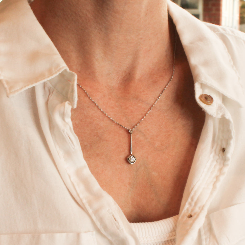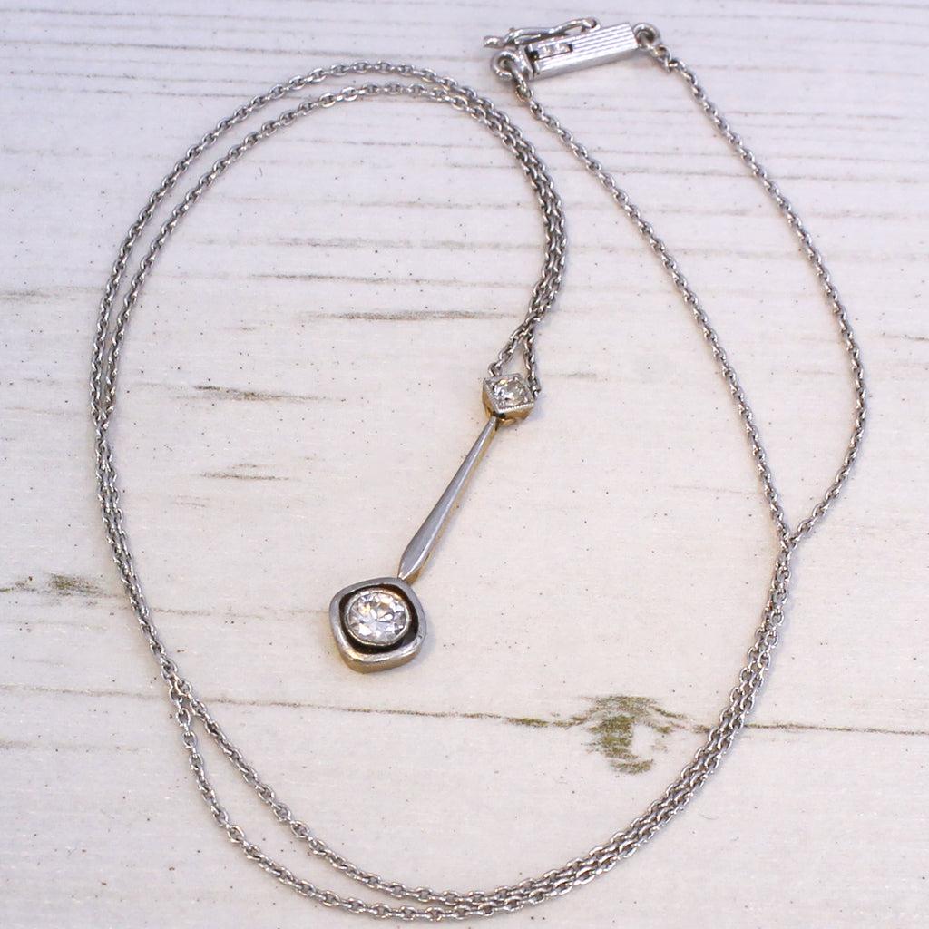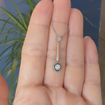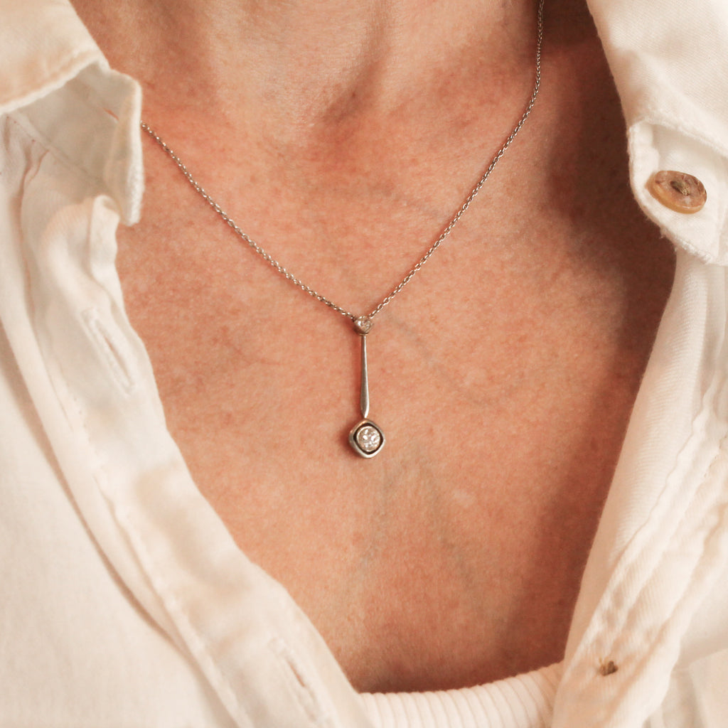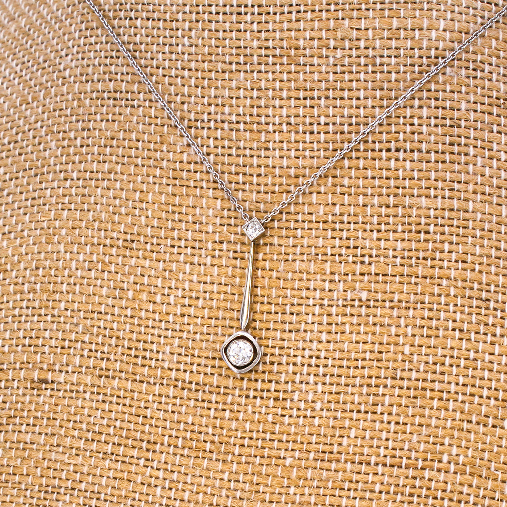 [message]An elegant Art Deco diamond pendant which absolutely aches with charm. The old European cut diamond at the bottom is rubover set in platinum, and floats with in a soft square halo. A linking bar attaches the bottom diamond to a smaller old European cut diamond at the top, which is set in an articulated square collet.