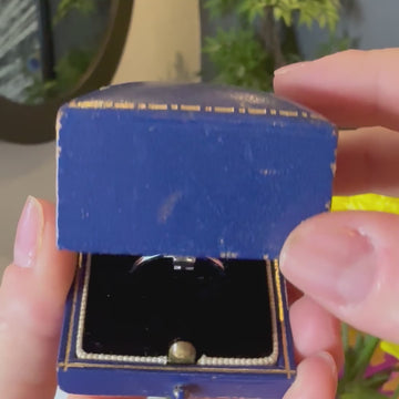 An elegant and sleek vintage diamond solitaire featuring a bright and icy baguette cut. The diamond is rubover set in platinum and sit on a slim platinum shank.