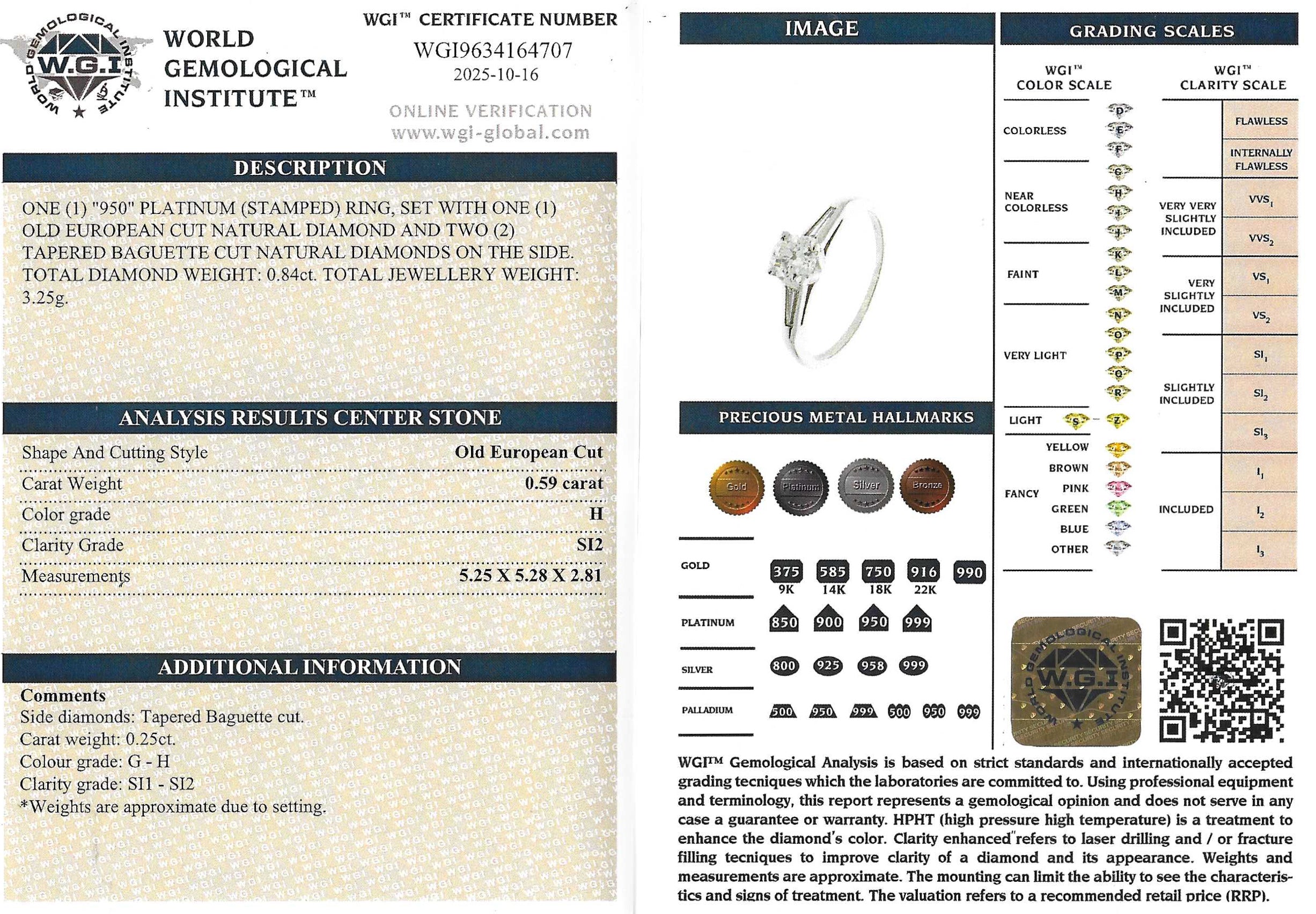 [message]A sleek and beautiful Art Deco engagement ring. The old European cut diamond in the centre is white, bright and full of fire and brilliance. The stone is secured in a four claw platinum collet, with an open 'V' gallery which allows maximum light to pass through the diamond. A pair of tapered baguettes are set either side of the centre stone, leading to a slender platinum shank.