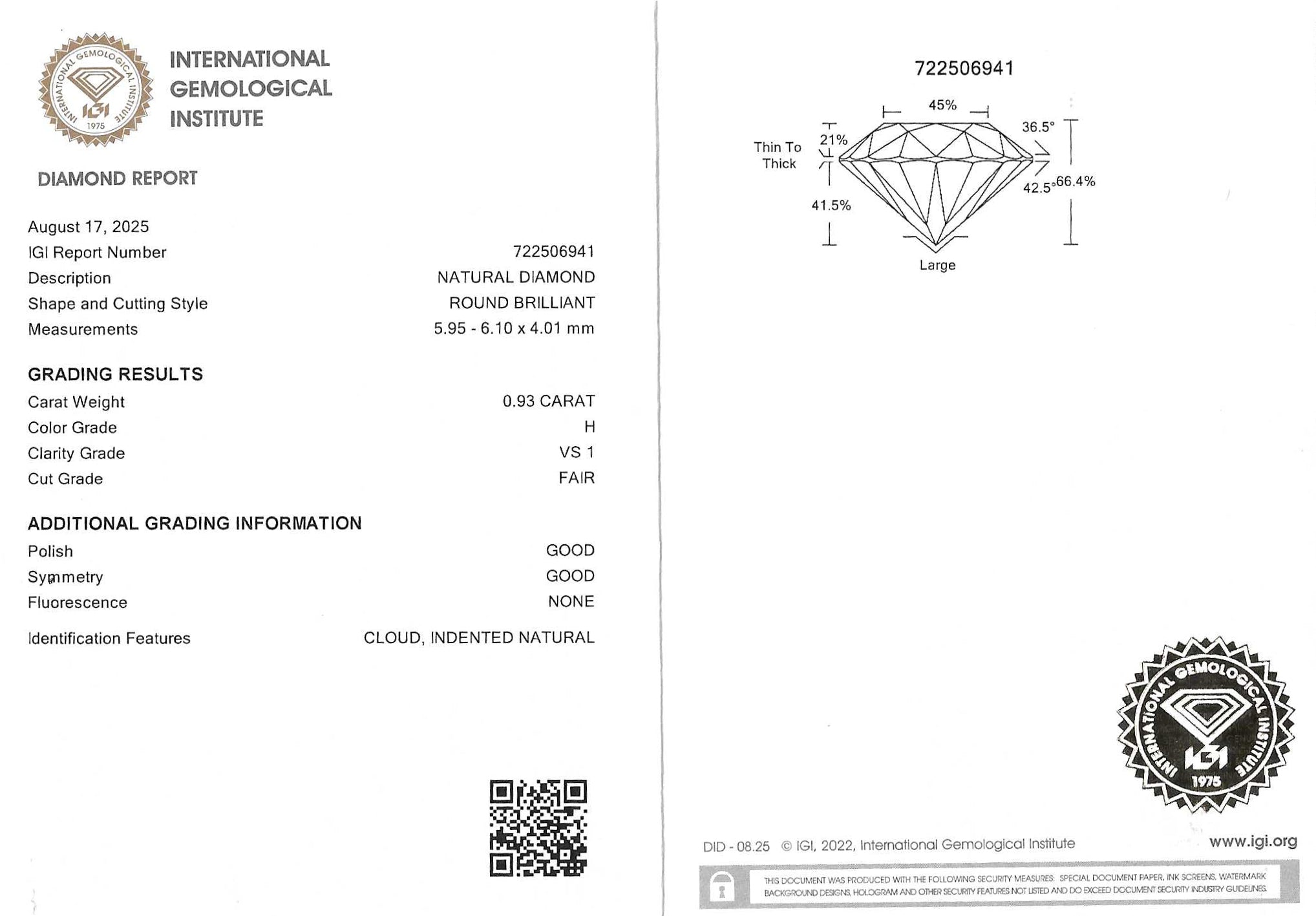 Accompanied by a Diamond Report from IGI.