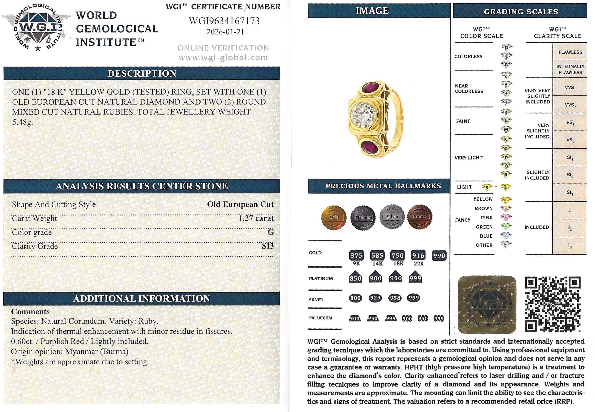 [message]A fabulous Art Deco three stone ring featuring a white and bright 1.27 carat old European cut diamond which is rubover set in yellow gold within a rose gold 'box', with a pair of bright red pigeon blood Burmese rubies either side. The crisp, geometric detailing in the gallery leads to a wide, flat 18k rose gold shank.