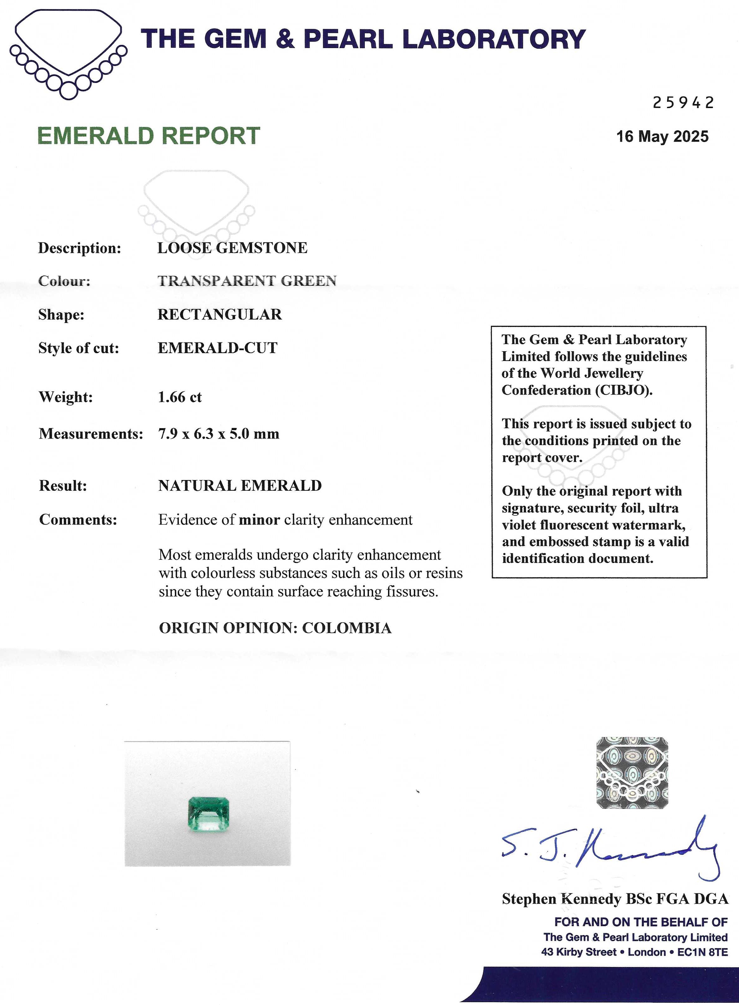 Accompanied by an emerald report from The Gem & Pearl Laboratory stating the emerald shows evidence of minor clarity enhancement, and is Colombian in origin.