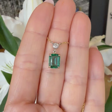 [message]A fine, rare and utterly beautiful emerald pendant necklace. The principle emerald - certified as having received no oiling or clarity enhancement - displays a bright and vivid bluish green. The stone is secured in a four claw 18k yellow gold collet, and dangles from a bright and white old mine cut diamond (rubover set in platinum), which is attached to a 16 inch yellow gold trace chain.