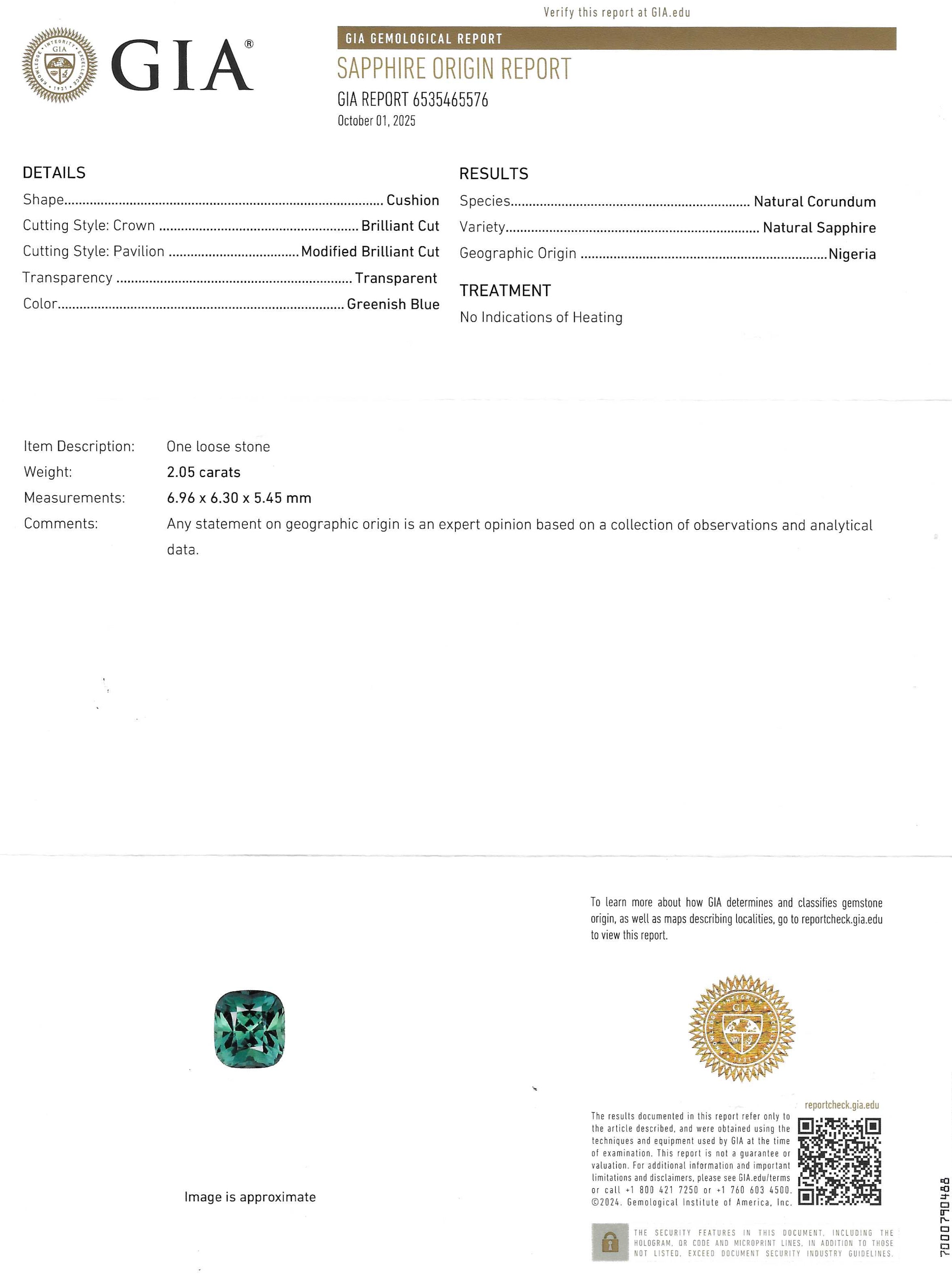 Accompanied by a sapphire report from GIA stating the sapphire shows no evidence of heating.