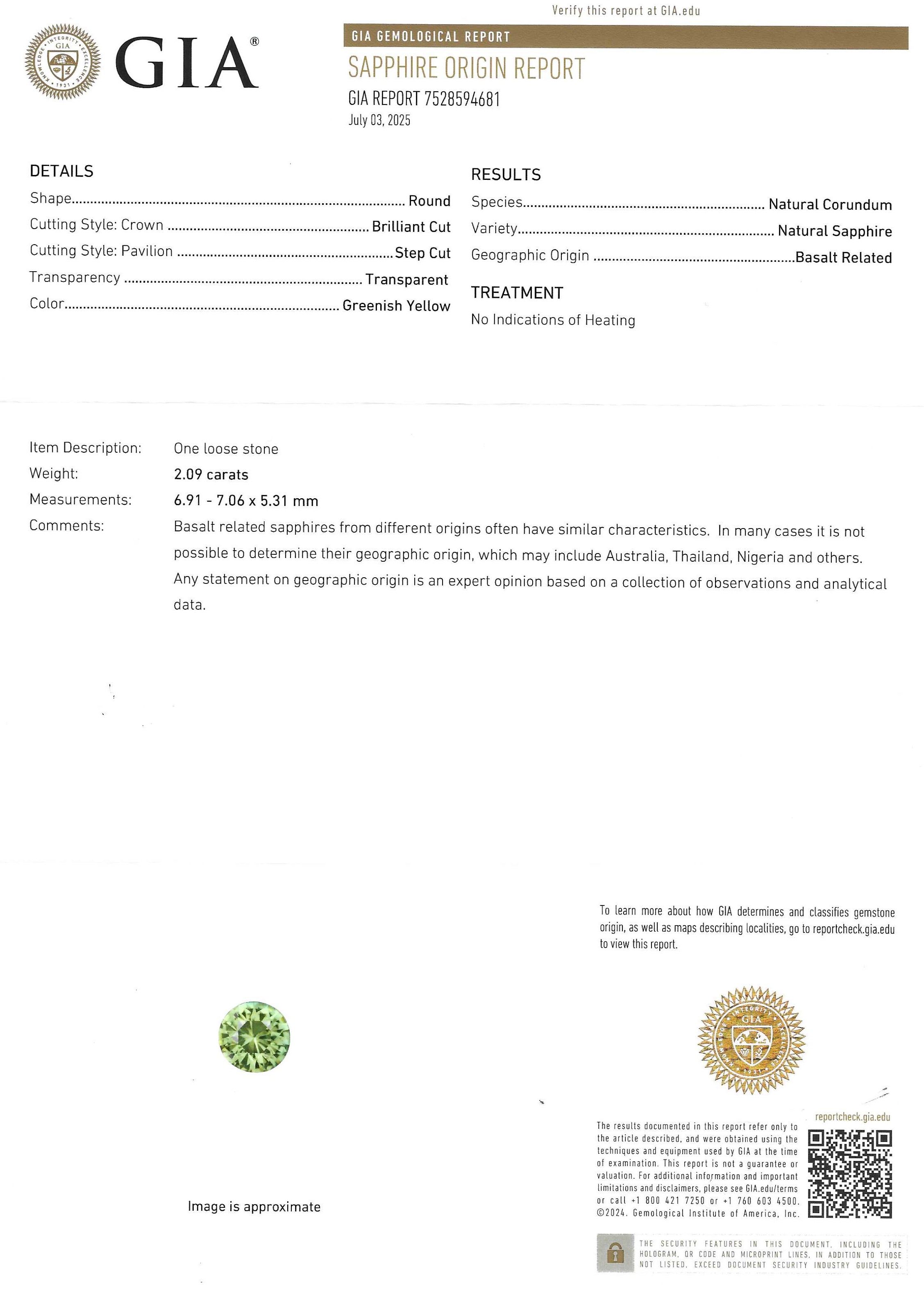 Accompanied by a sapphire report from GIA stating the sapphire shows no evidence of heating.