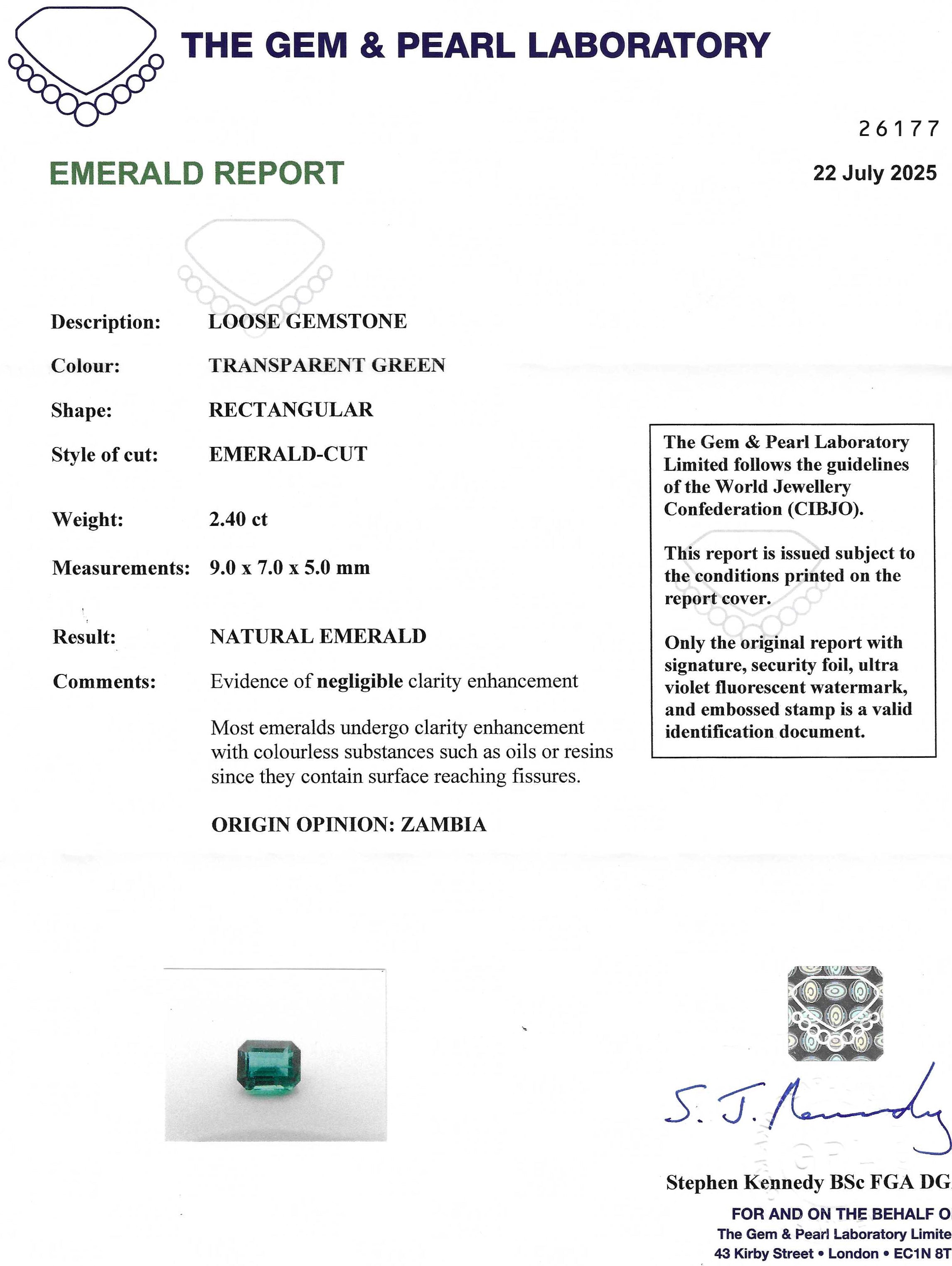 Accompanied by an emerald report from The Gem & Pearl Laboratory stating the emerald shows evidence of only negligible clarity enhancement, and is Zambian in origin.