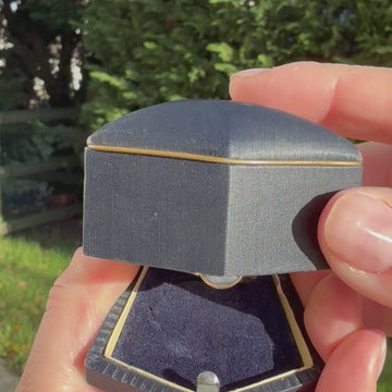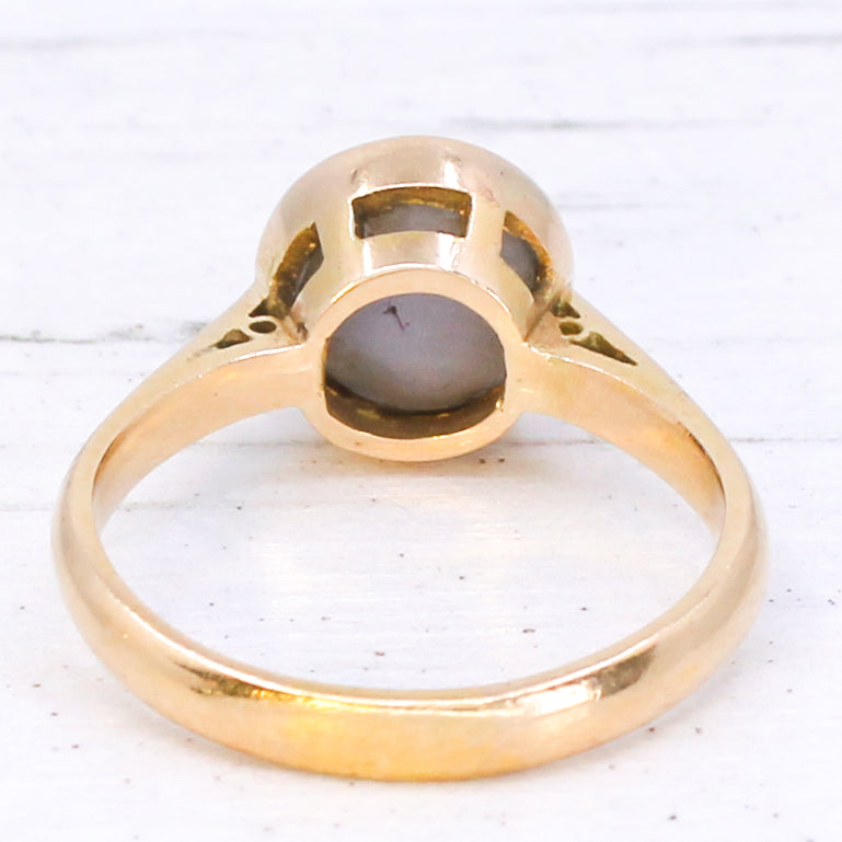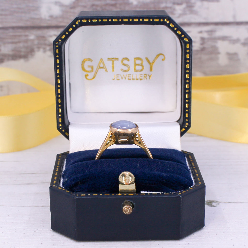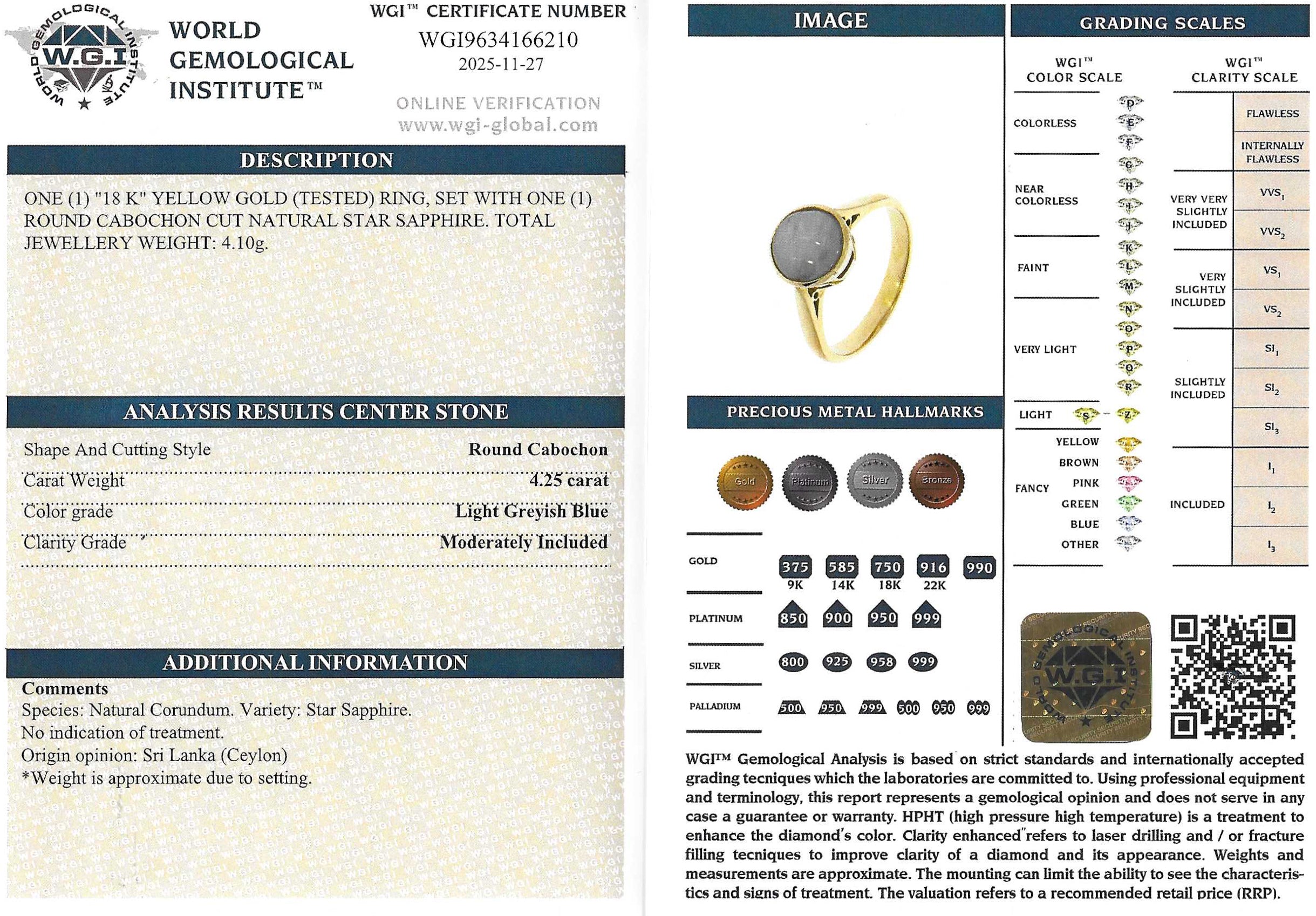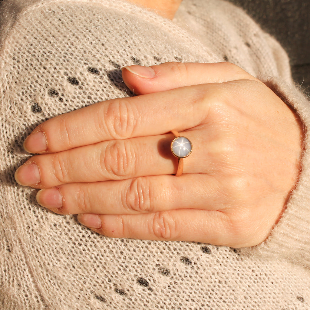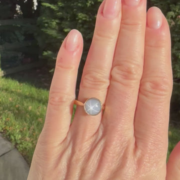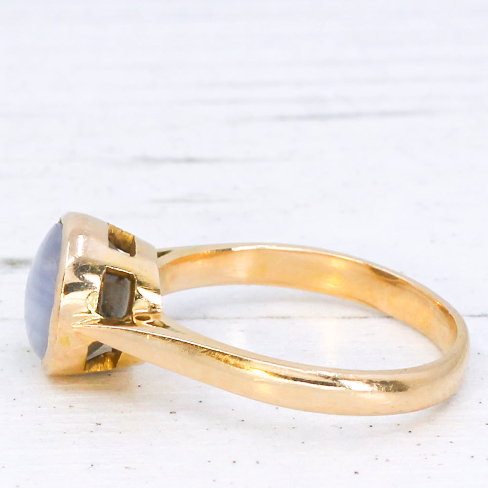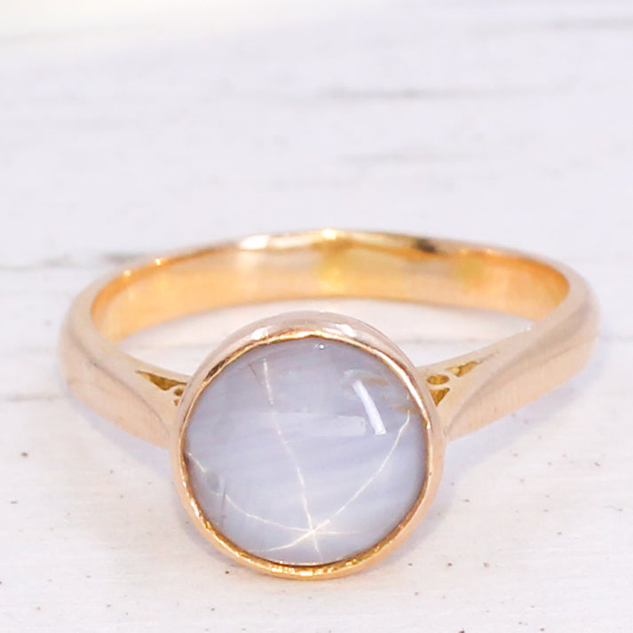 [message]A high class vintage solitaire ring featuring an unheated star sapphire from Ceylon. The sapphire holds a light, greyish blue background colour and displays a strong and clear asterism. Rubover set in 18k yellow gold, and leading to a slender 18k yellow gold shank which tapers at the shoulders.