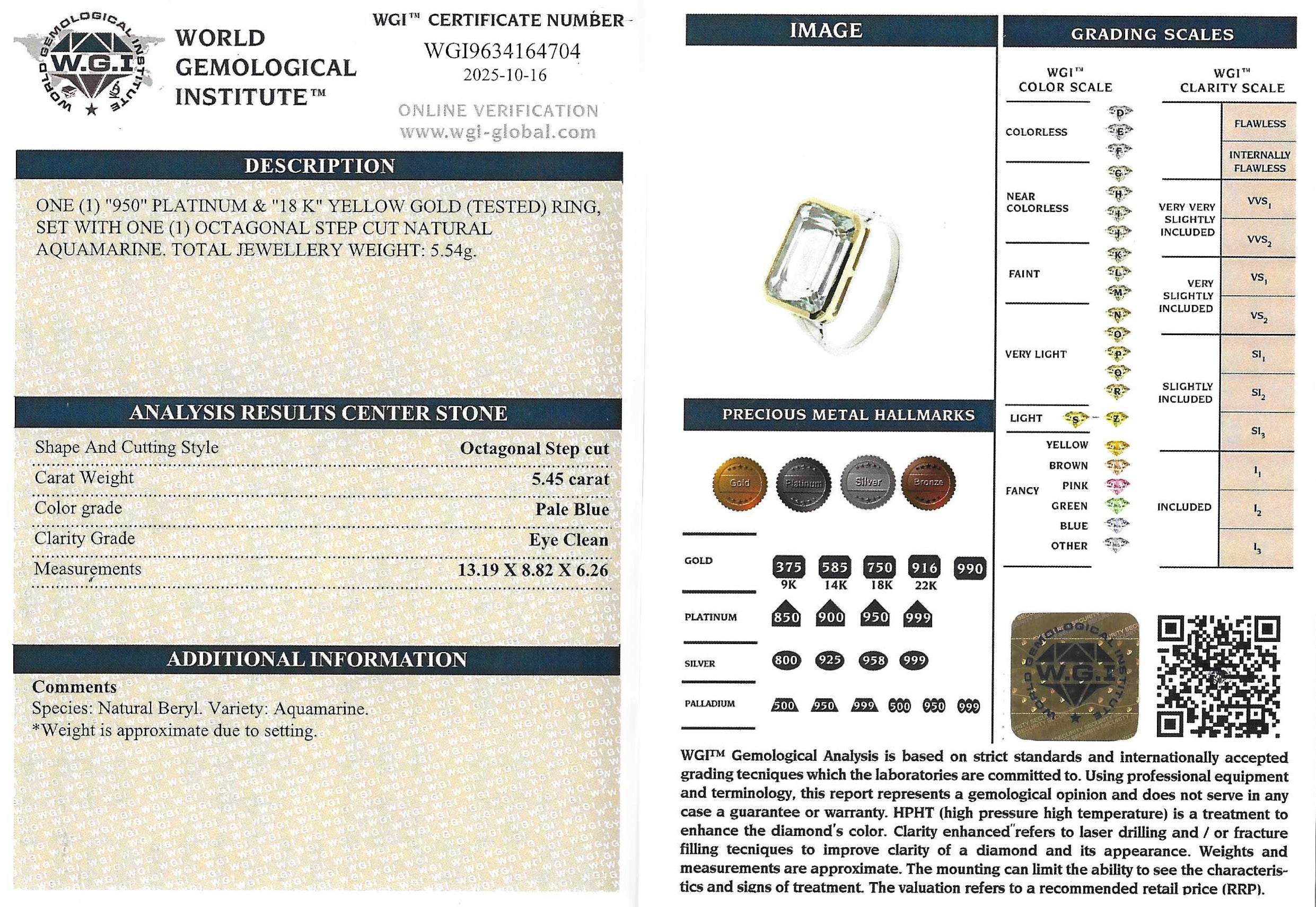 [message]A truly elegant Mid Century aquamarine ring. The glowing, pale blue aquamarine is laterally set in 18k yellow gold and sits a beautifully intricate ring with stepped shoulders and ornate scroll detailing in the gallery.