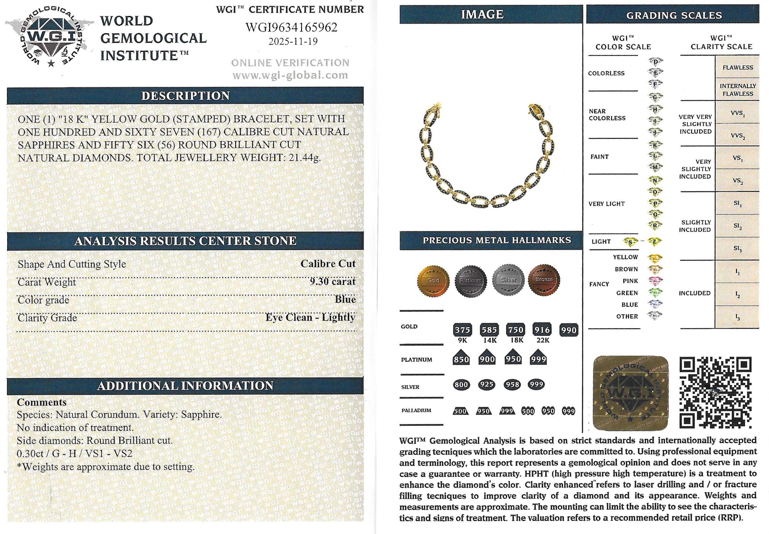 [message]An incredibly beautiful vintage bracelet set with 167 natural and unheated sapphires (with a total approximate carat weight of 9.30), and 56 round brilliant cut diamonds. The calibré cut sapphires are channel set over 14 links, and connected by bars set each set with four round brilliant cut diamonds.