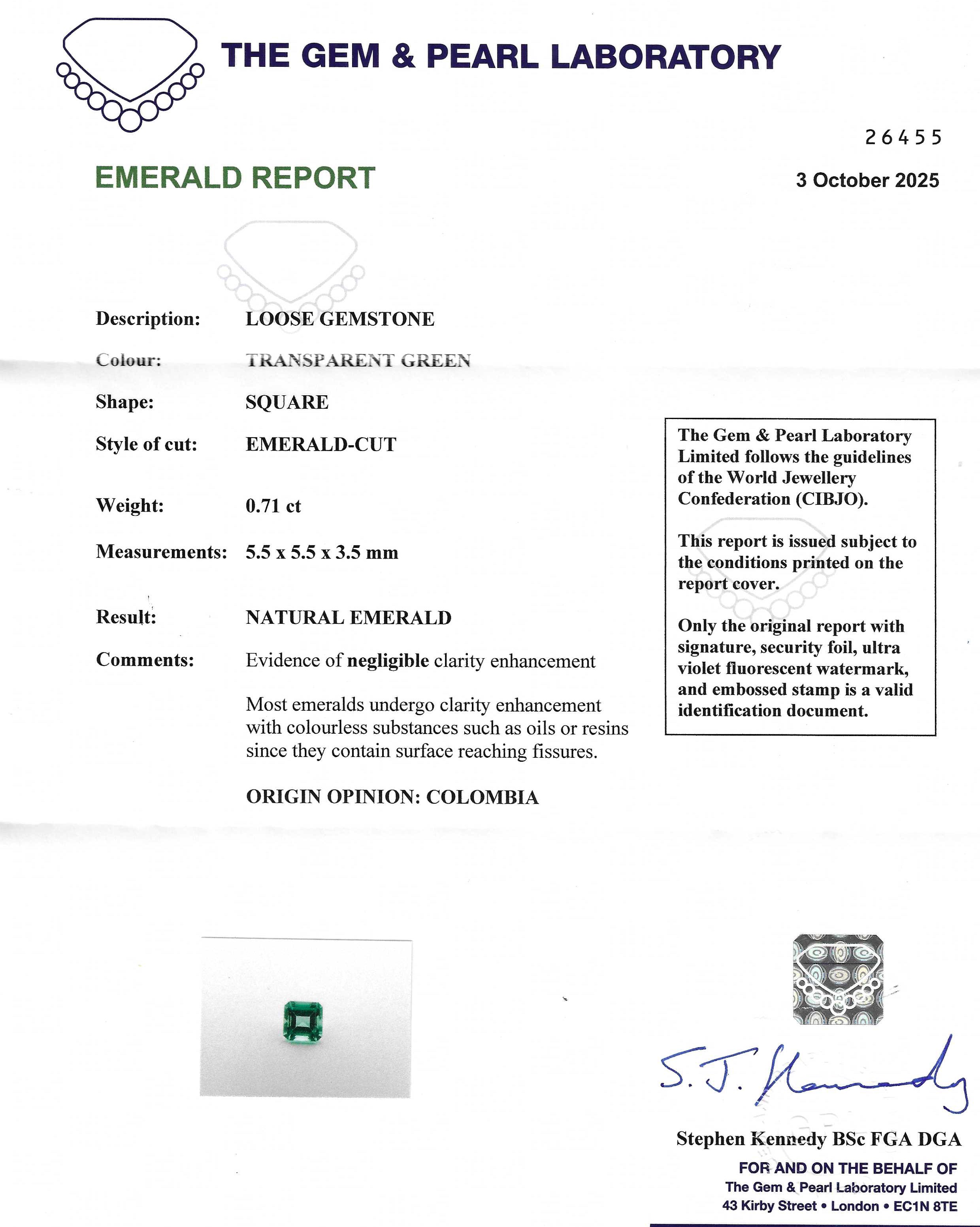 Accompanied by an emerald report from The Gem & Pearl Laboratory stating the emerald shows evidence of moderate clarity enhancement, and is Colombian in origin.