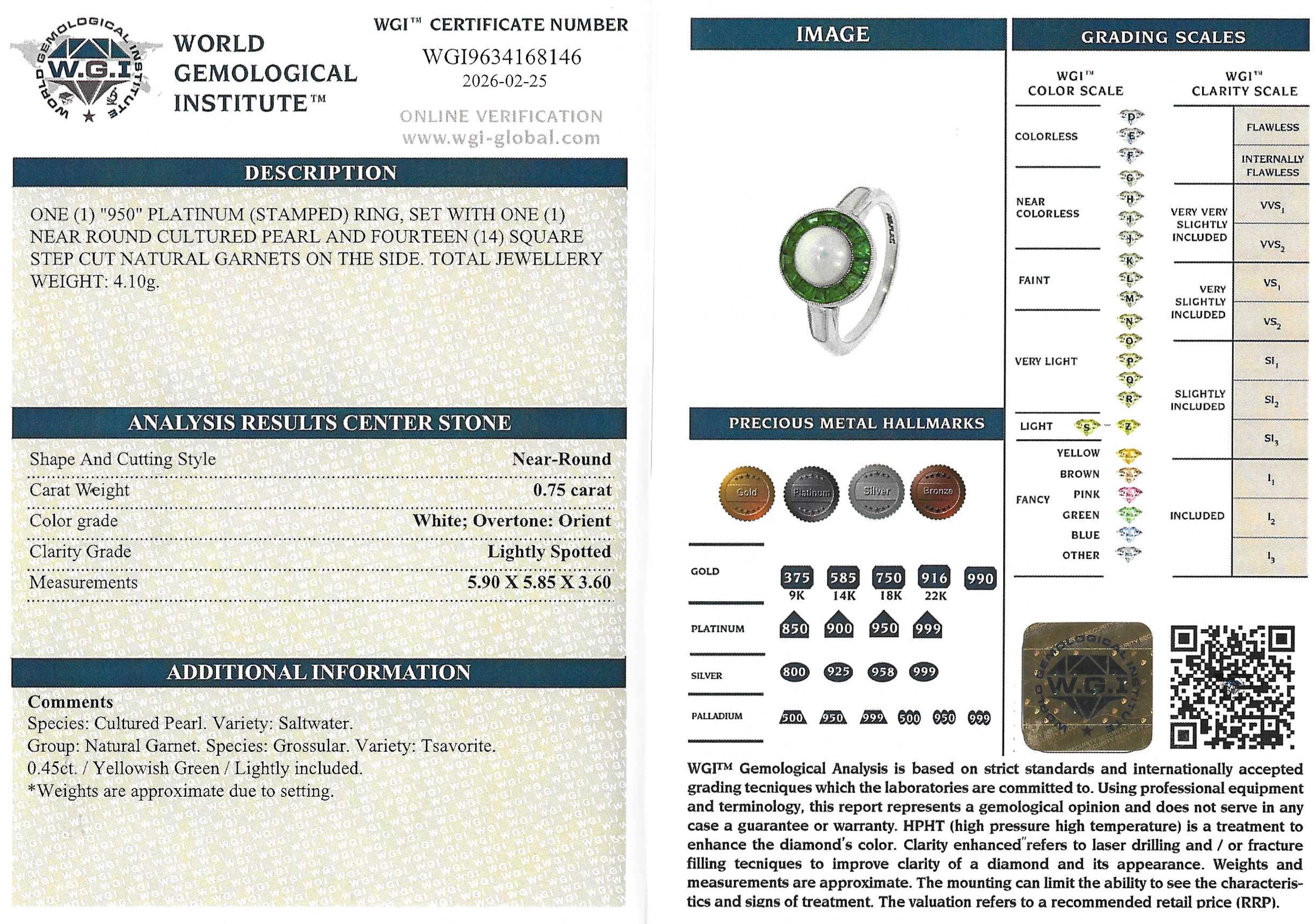[message]A fabulous and unique vintage cluster ring. At the centre of the cluster is lustrous white pearl, which sits within an unbroken surround of 14 calibré cut electric green tsavorite garnets with in a border of milgrained platinum. Further decorative milgraining in the shoulders leads to a slim platinum shank.