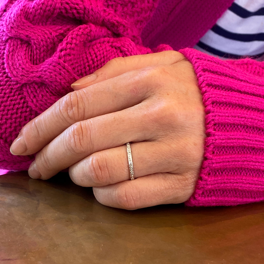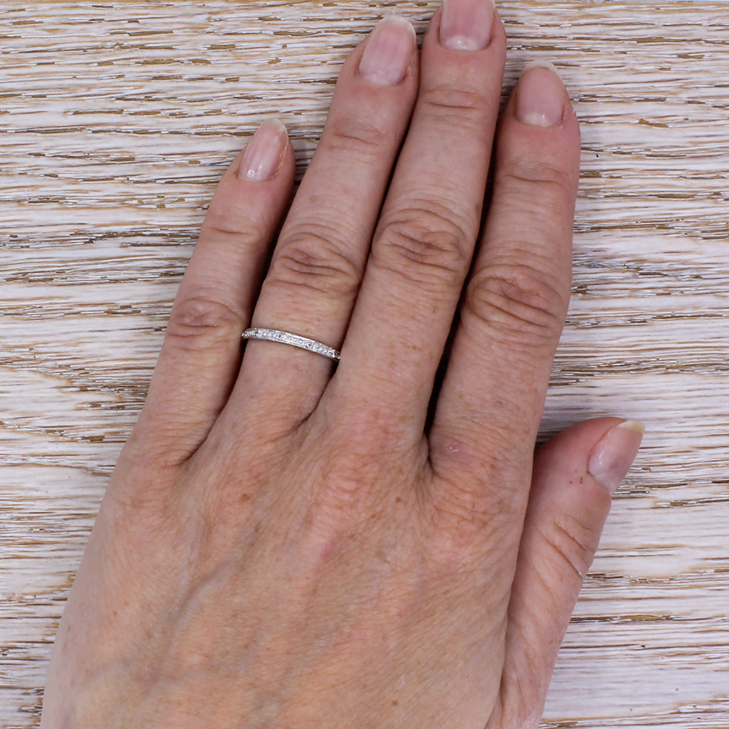 A beautifully detailed ring that adds a little something to an engagement ring / wedding band stack without dominating. Set with round brilliant cut diamonds which are spaced apart with subtle bead detailing. A bit of sparkle to compliment a diamond or gem-set ring.